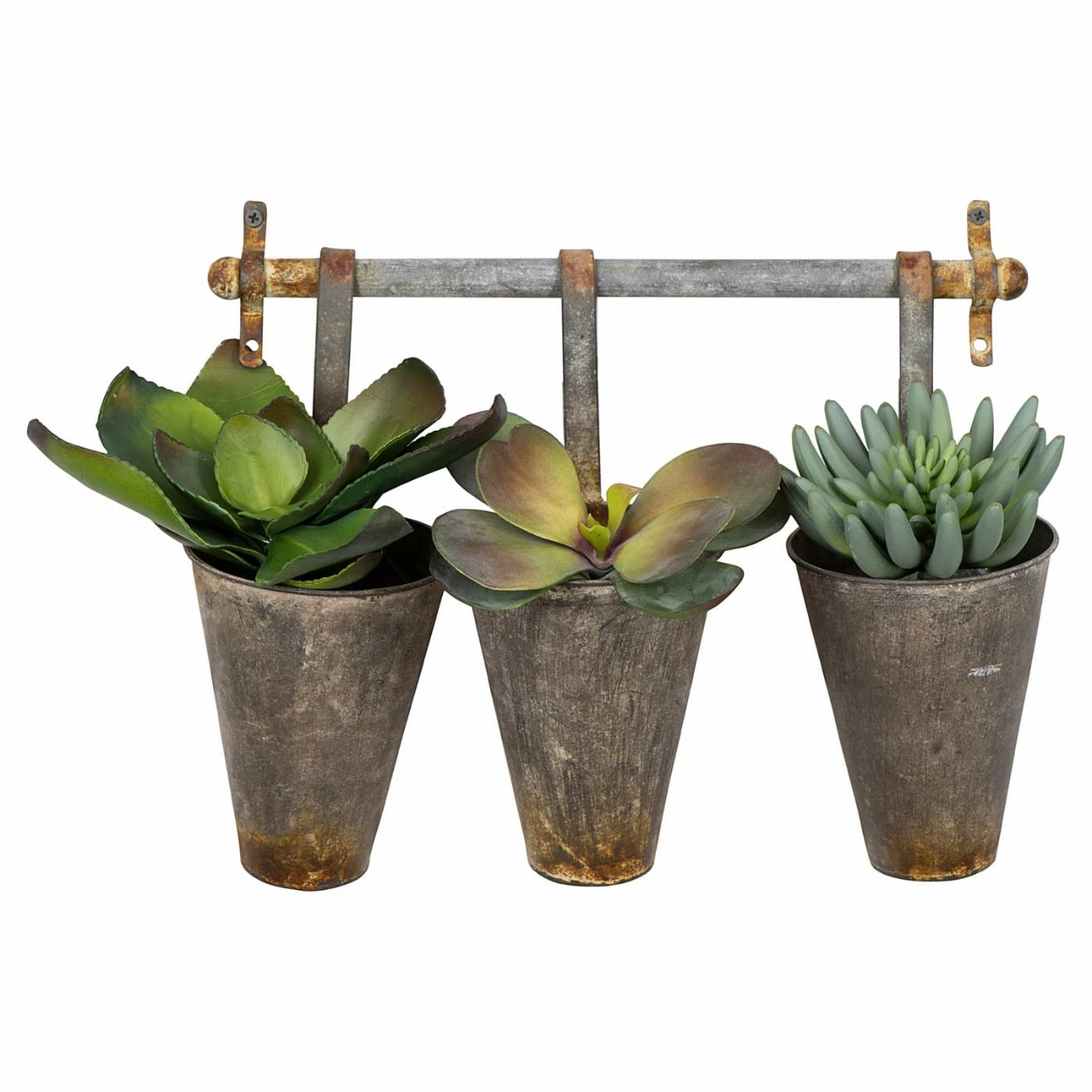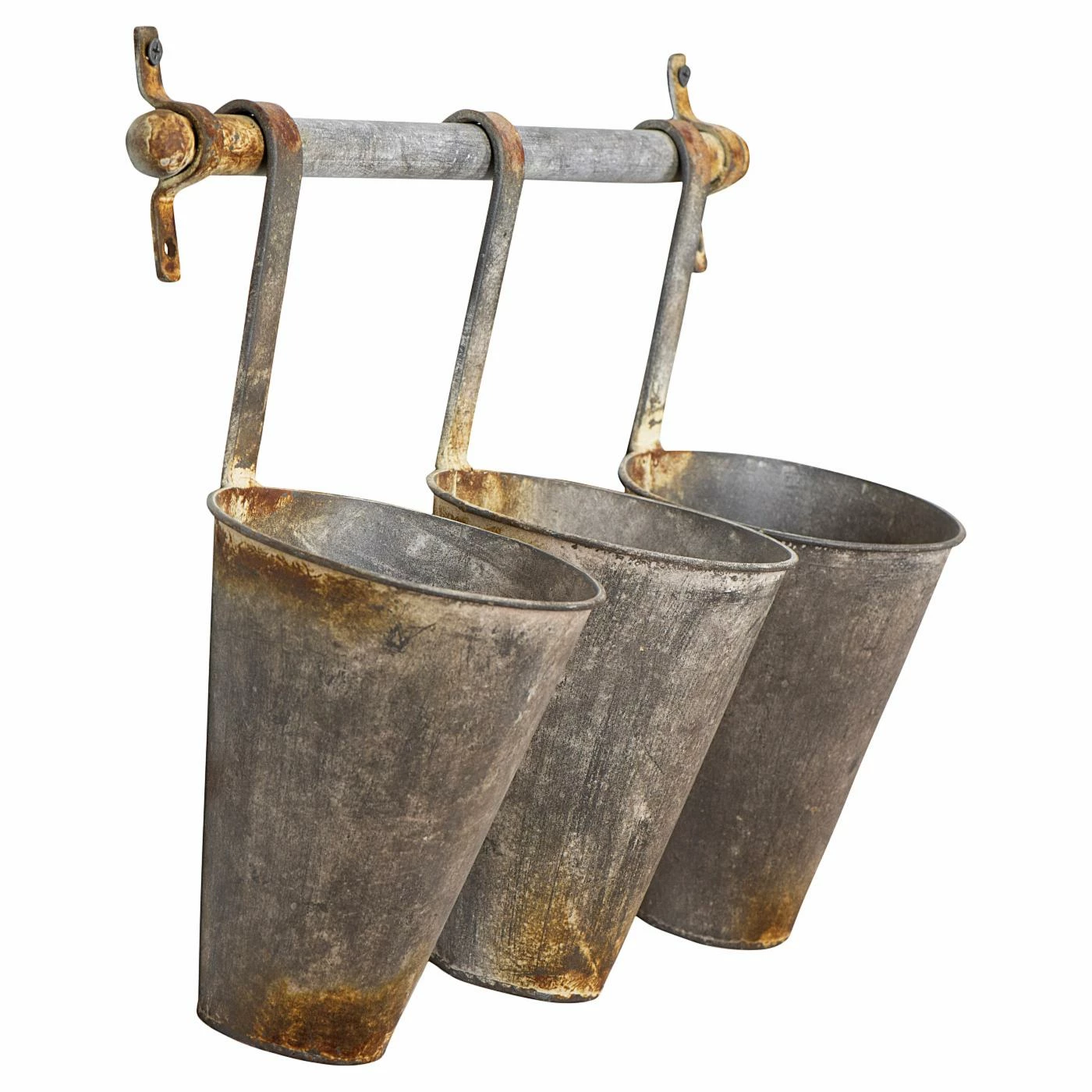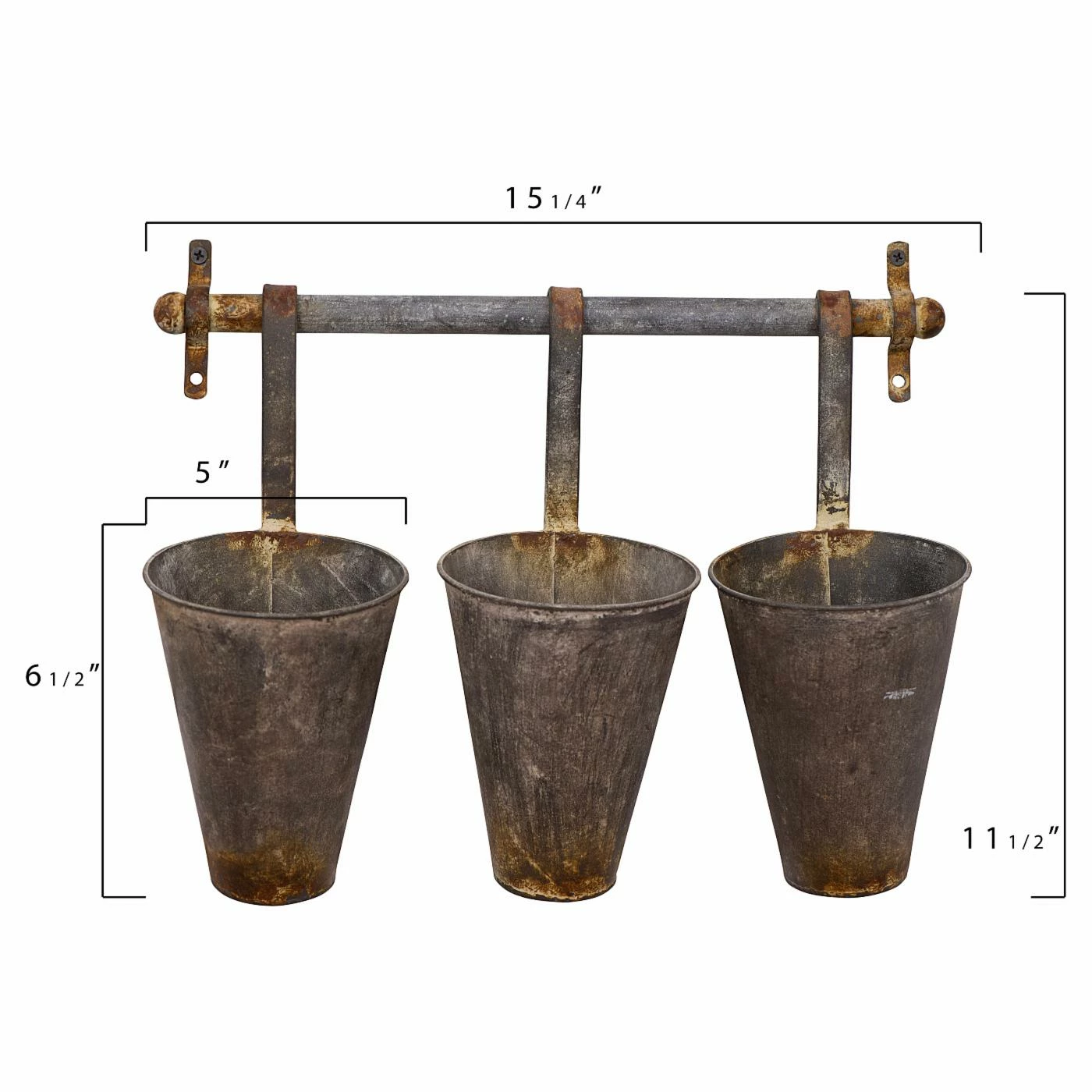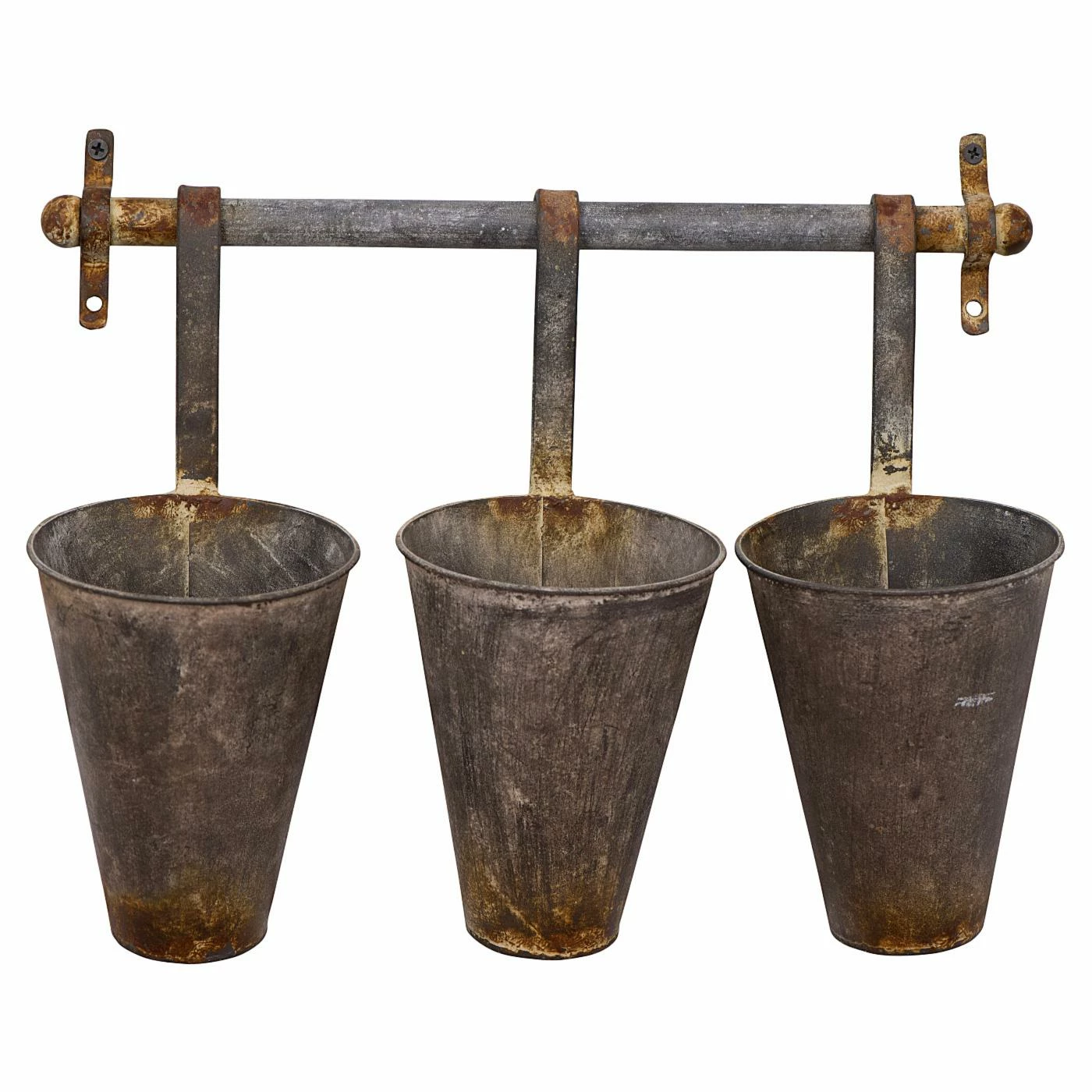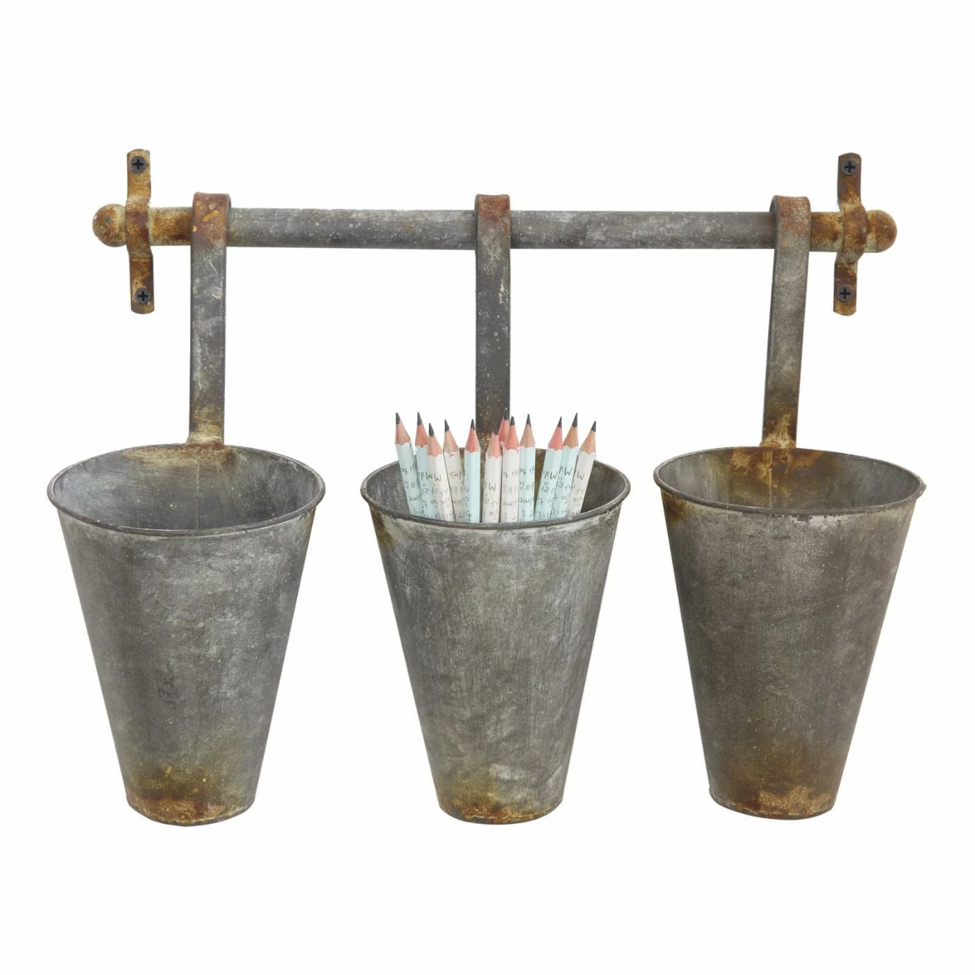 From fresh flowers to office supplies, the 3R Studios Antiqued Metal Wall Rack with 3 Hanging Tin Pots offers your home a rustic way to enjoy unique storage and organization. This sturdy metal wall rack is accented in an antiqued finish, and three tin pots hang beneath, offering you a place to stash or display anything you wish inside.