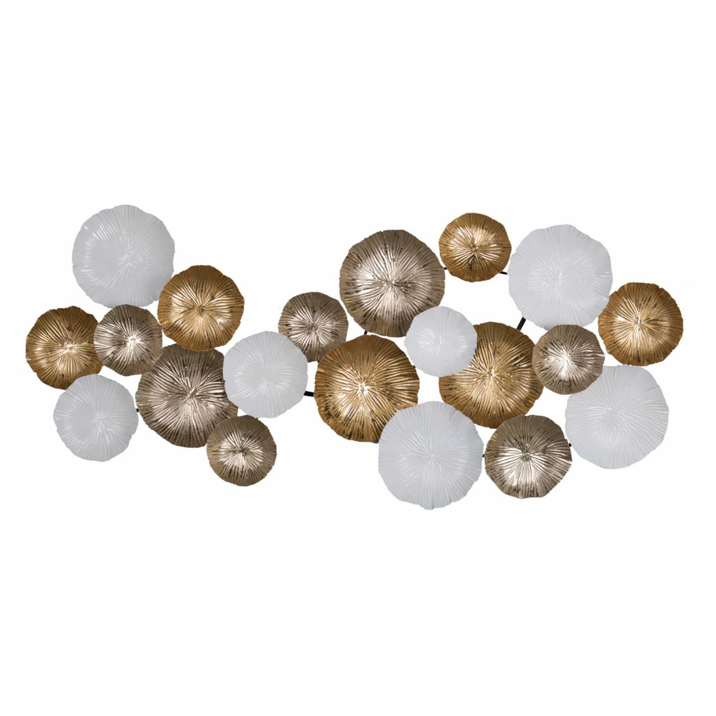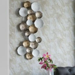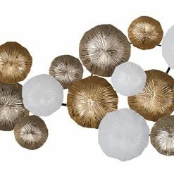 Subtly domed and artfully grooved A and B Home Ryder Large Wall Accent is brimming with depth and texture. This large wall accent features a creatively overlapped grouping of white, gold, and pewter-finished metal circles that turns your empty wall into a creative focal point.