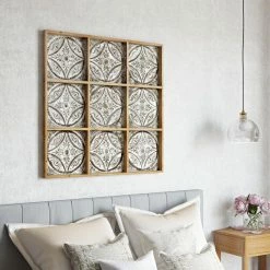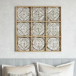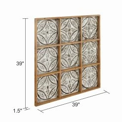 Versatile and able to match many styles, the Aspire Home Accents Sproule Large Wood Wall Decor features metal embossed tiling motif in a wood frame. Together the individual squares make up a beautiful pattern of interconnected circles. The design features antique brown finish with a white-wash for age and character. It’s eclectic style will look great in any room.