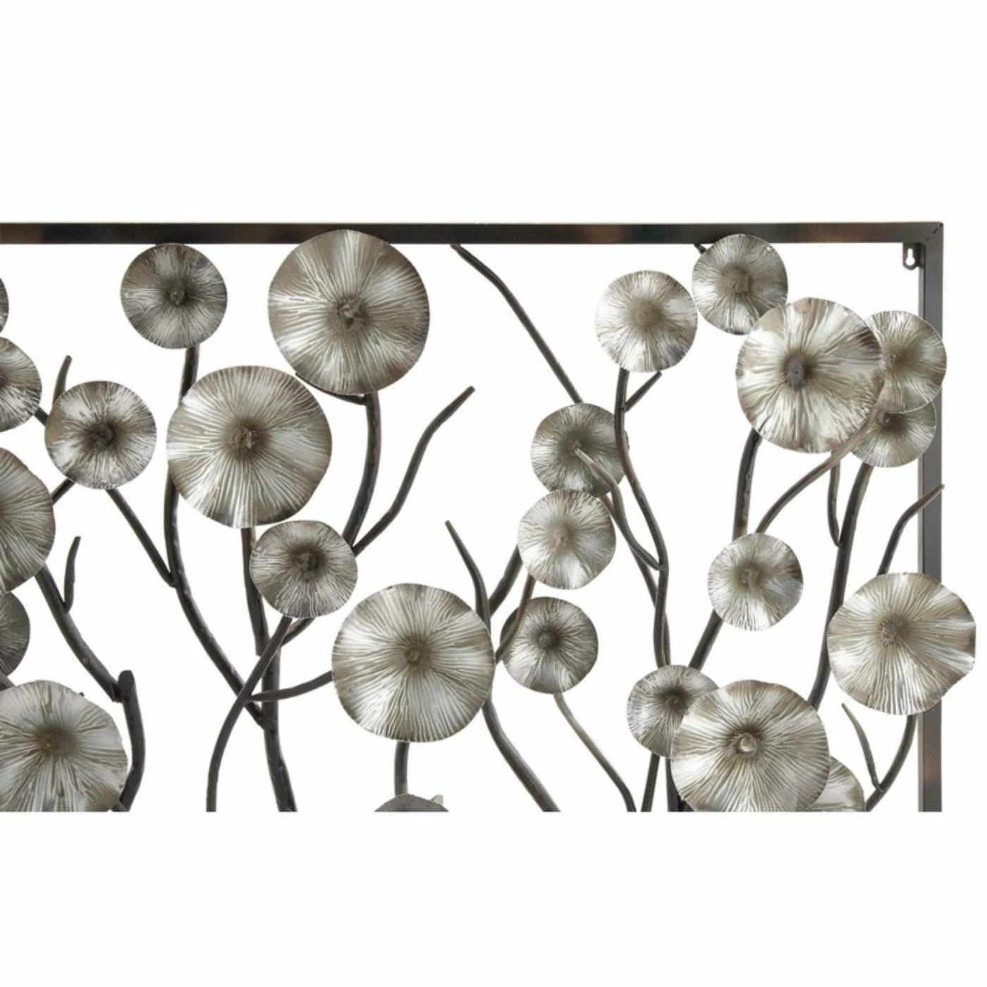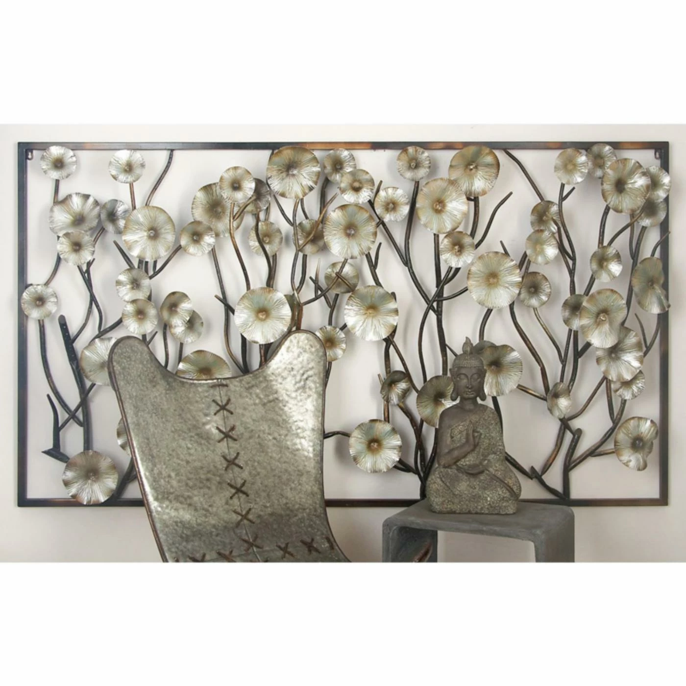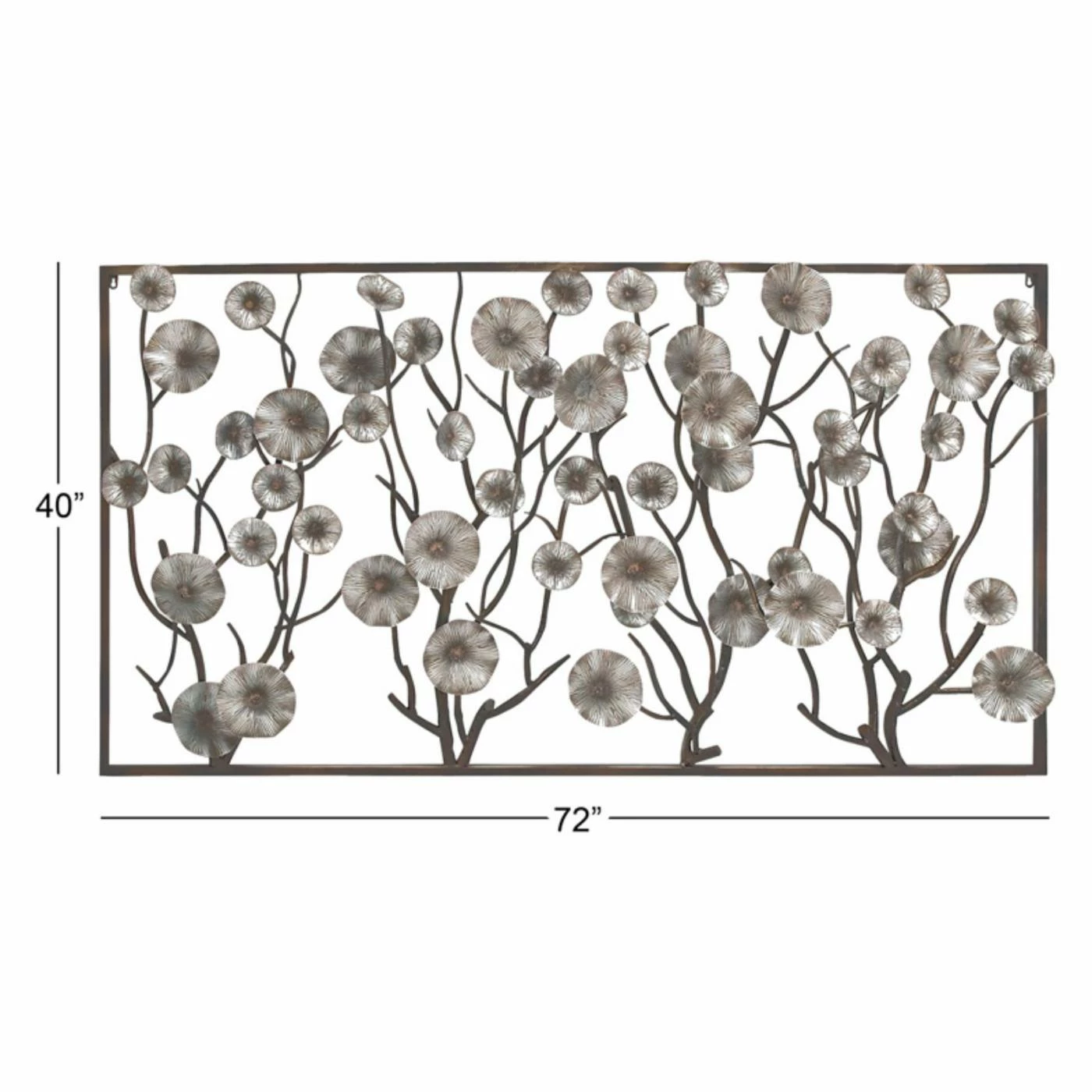 Add beauty to your wall with the DecMode Framed Rectangular Sculpted Metal Flowers Wall Sculpture – 72W x 40H in.. Made of resilient iron, this wall sculpture features curving branches and flowers encased in a rustic dark brown frame. The light gray petals are accented by streaks of dark brown.