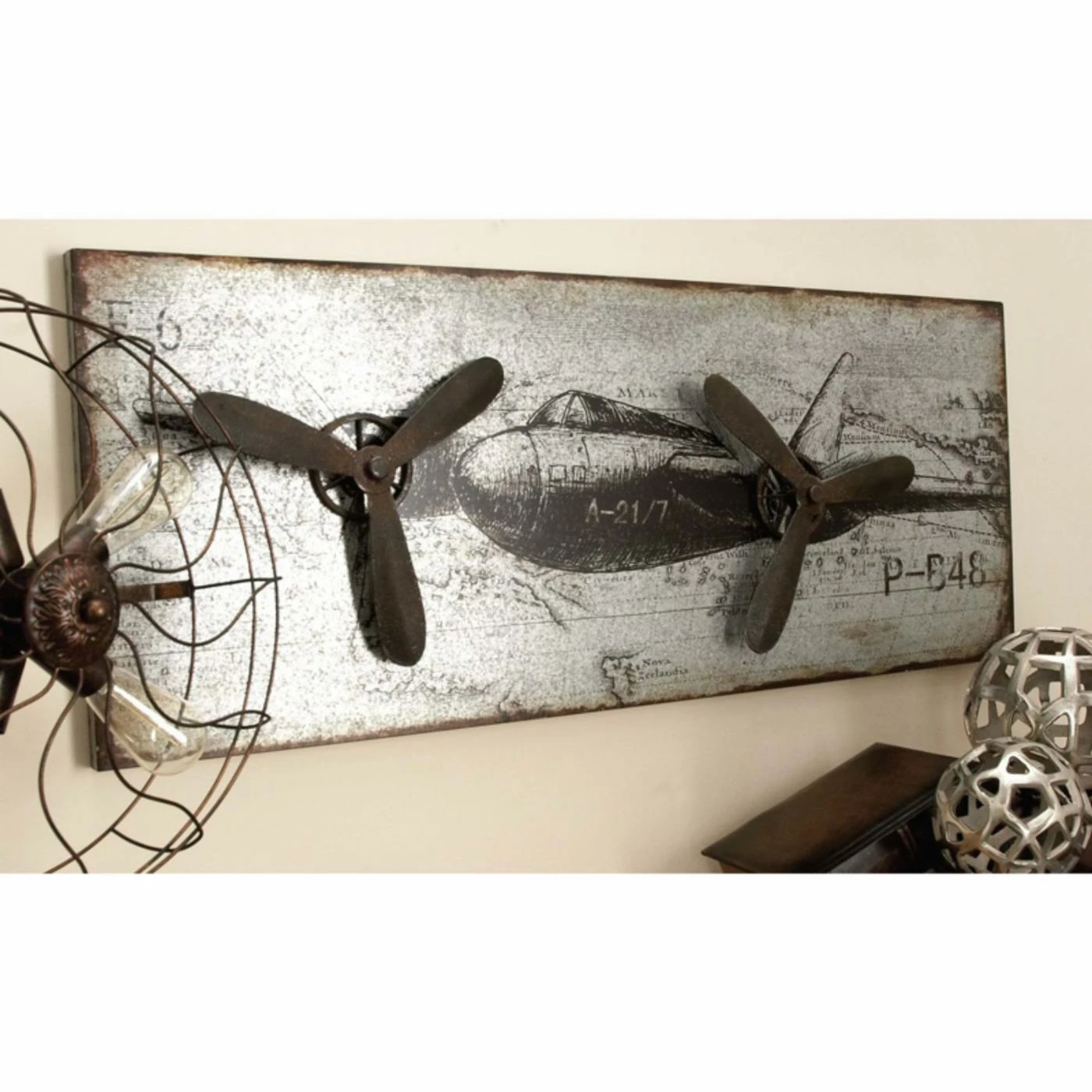 Loaded with rustic, vintage appeal, the DecMode Metal Airplane Sculpture brings visual interest to your industrial decor. This aeronautically inspired wall piece features a distressed, whitewash finish and three-dimensional propellers for depth and texture.