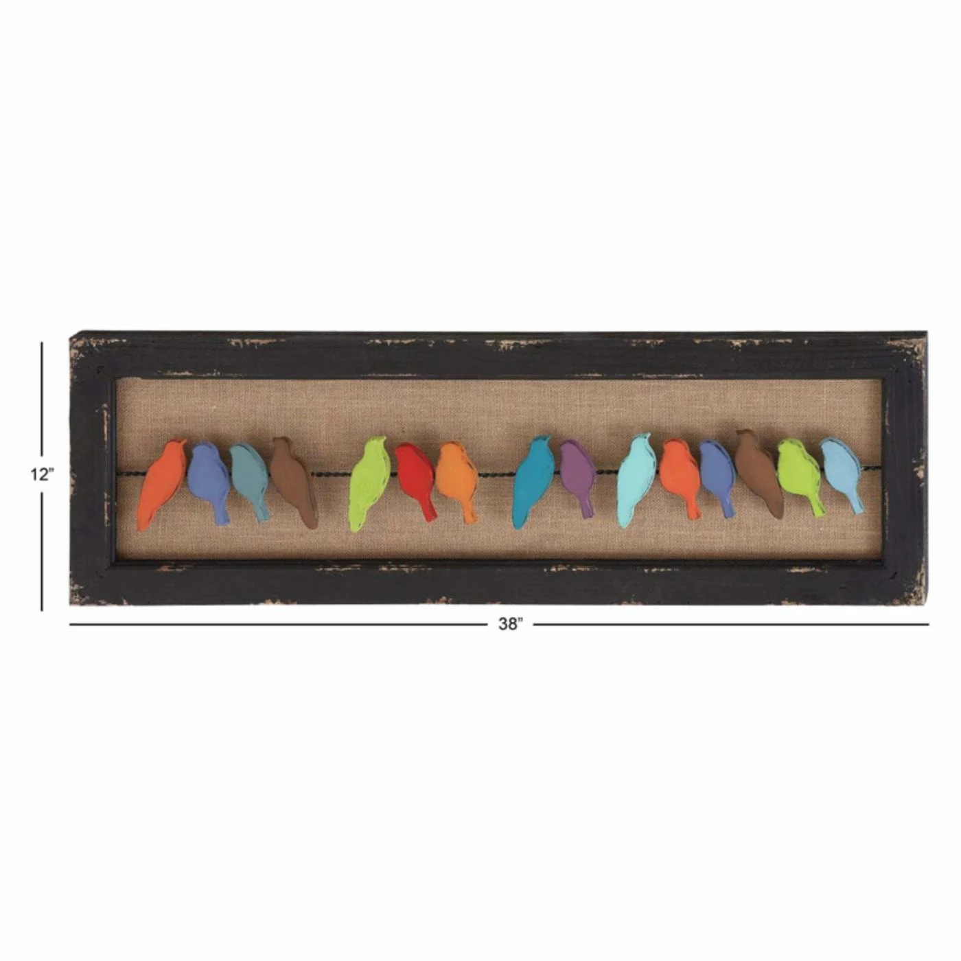Brighten your farmhouse decor with the rustic charm of DecMode Metal & Wood Bird Silhouette Wall Sculpture. This distressed finish accent piece features a flock of colorful birds perching precariously on a wire for a look with plenty of depth and dimension.