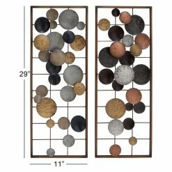 A myriad of metal discs adorns the DecMode Metal Discs Wall Sculpture – Set of 2, made of iron with a slender rectangular frame. This modern wall sculpture set is enriched with an assortment of finishes including black, gray, copper, and gold to bring your home a contemporary burst of color and design.