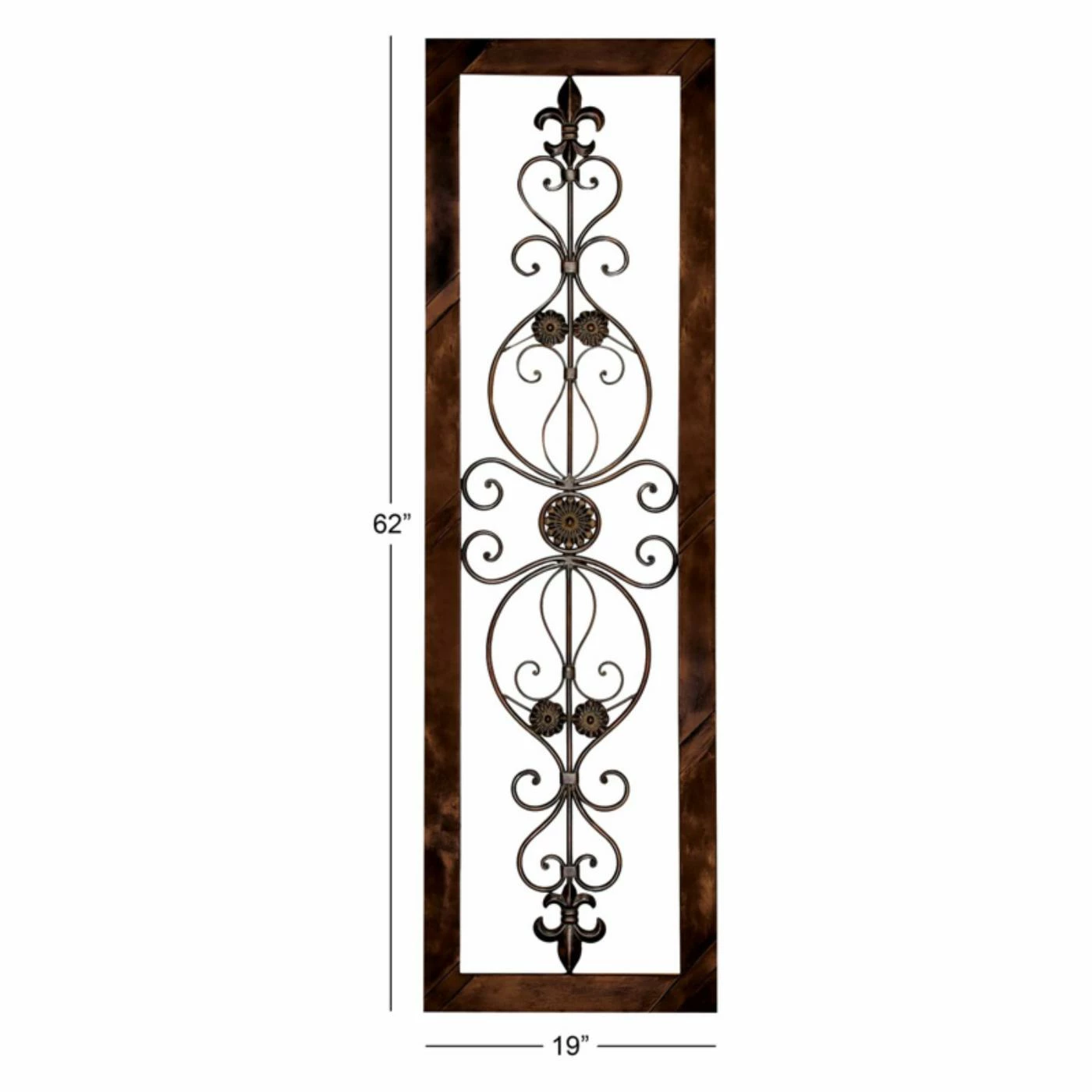 Drawing inspiration from ornate French style, the DecMode Metal Framed Wall Sculptureβs elegant design accents a room in sophisticated style. Wrought iron is crafted into intricate scrollwork detailed with fleur-de-lis, and itβs finished in an antiqued and mottled bronze to bring timeless appeal to this eye-catching decor piece.