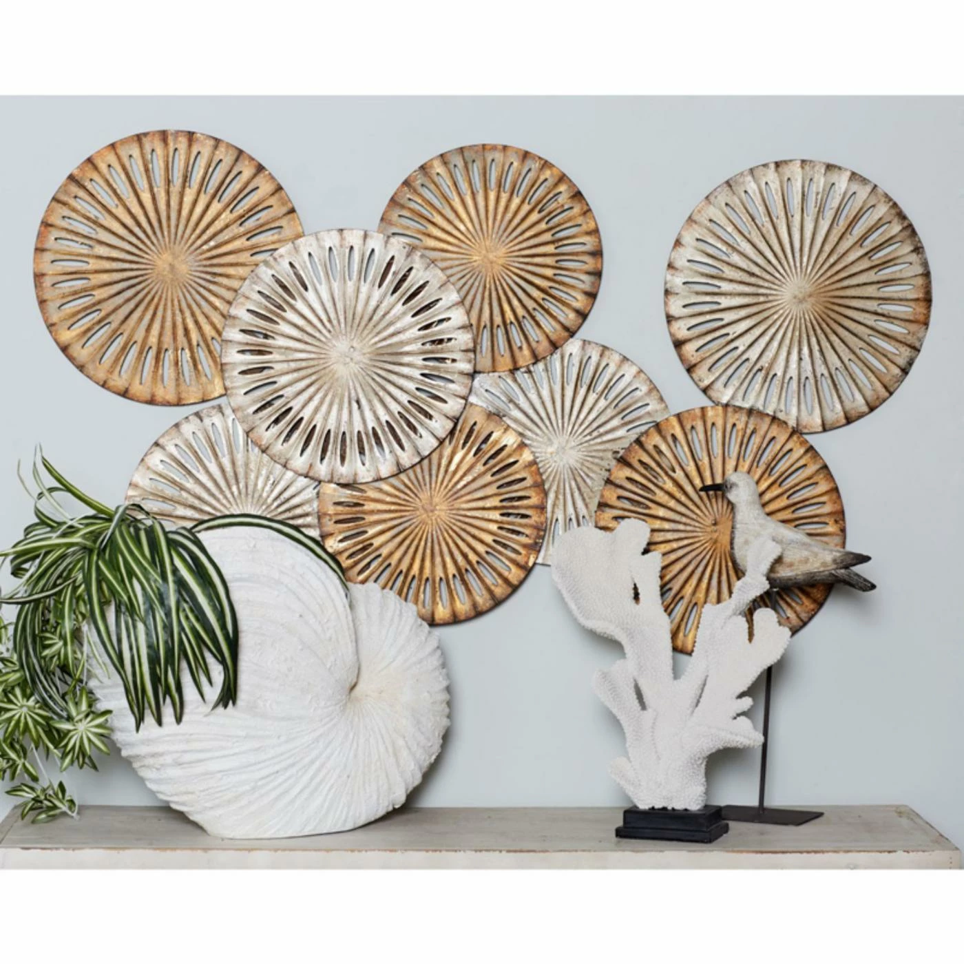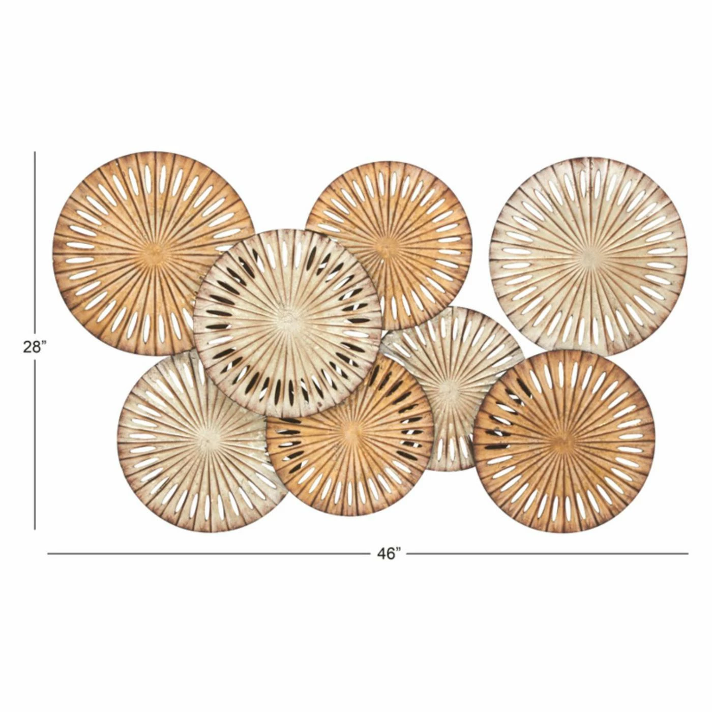 Oval cutouts lighten the look of the DecMode Metal Geometric Flowers Wall Sculpture. This neutrally hued accent piece brings eye-catching depth and dimension to a bare wall, enhancing your decor with its distressed charm.