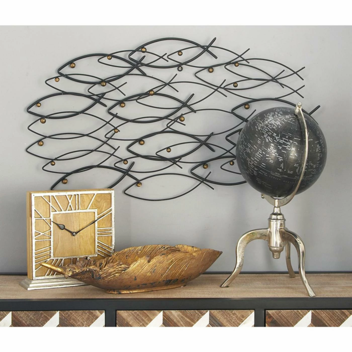 A semi-abstract school of fish swims across your wall with the DecMode Metal School Of Fish Wall Sculpture to create a peaceful undersea oasis in your home. The overlapping, three-dimensional design adds eye-catching artistic appeal to this iron wall sculpture, finished in cool gray and brown hues for a quiet, calming aesthetic that complements your decor.