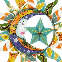 Enhance your space with the colorful whimsy of the DecMode Metal Sun Wall Sculpture. You’ll get the sun, the moon, and the stars in this brightly hued, textured wall accent.