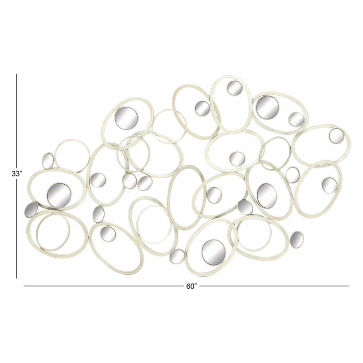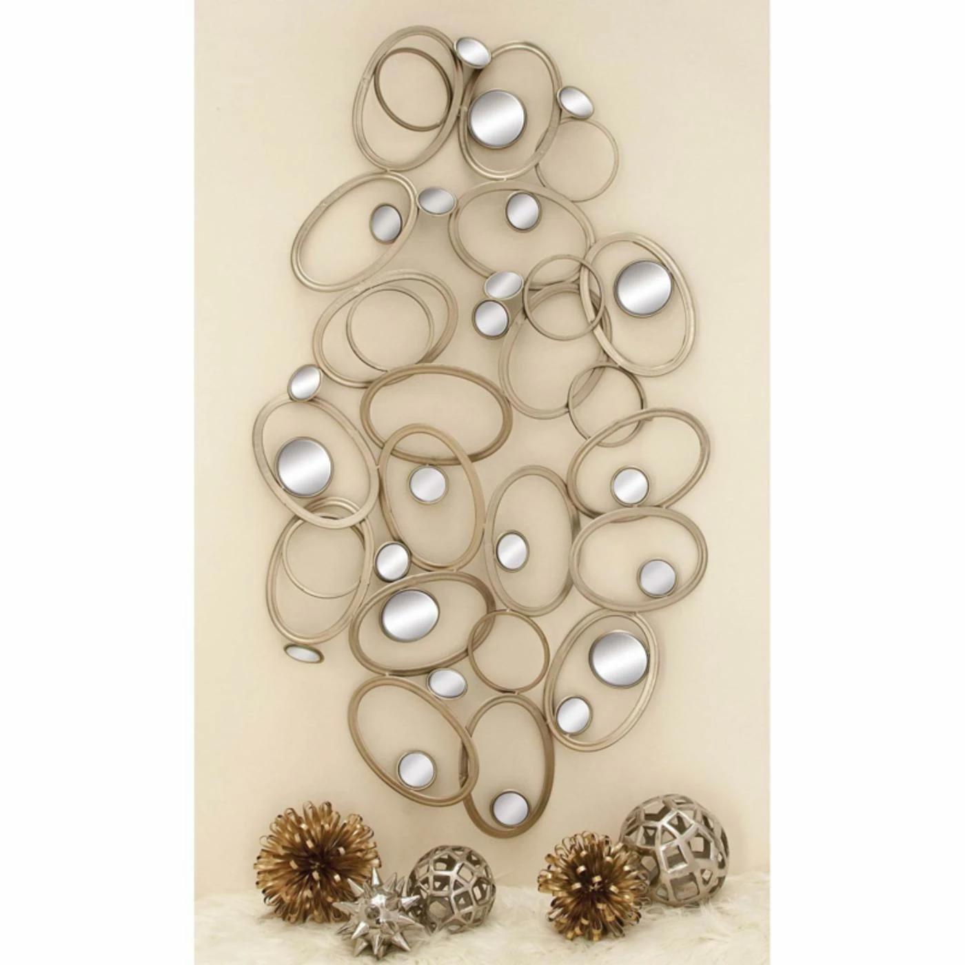 Update your home dΓ©cor with the ultramodern DecMode Oval Rings and Mirrors Metal Wall Sculptures – 60W x 33H in.. Sleekly designed, this wall sculpture features interlocking iron circles and small, round mirrors scattered throughout the piece.