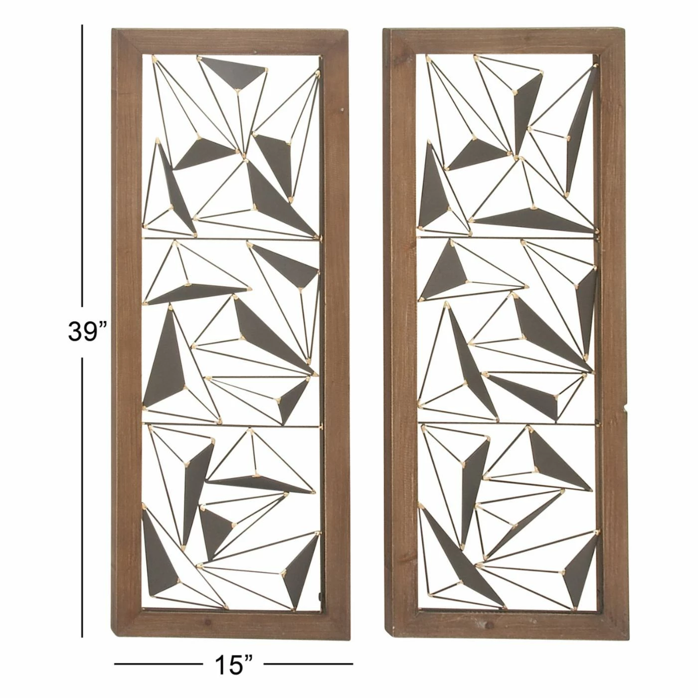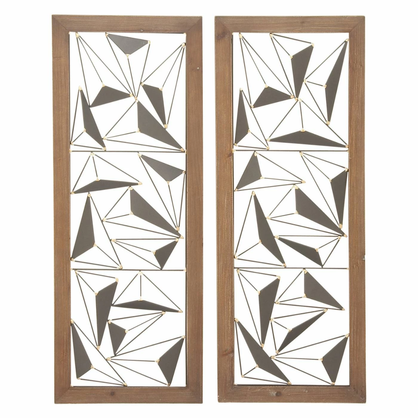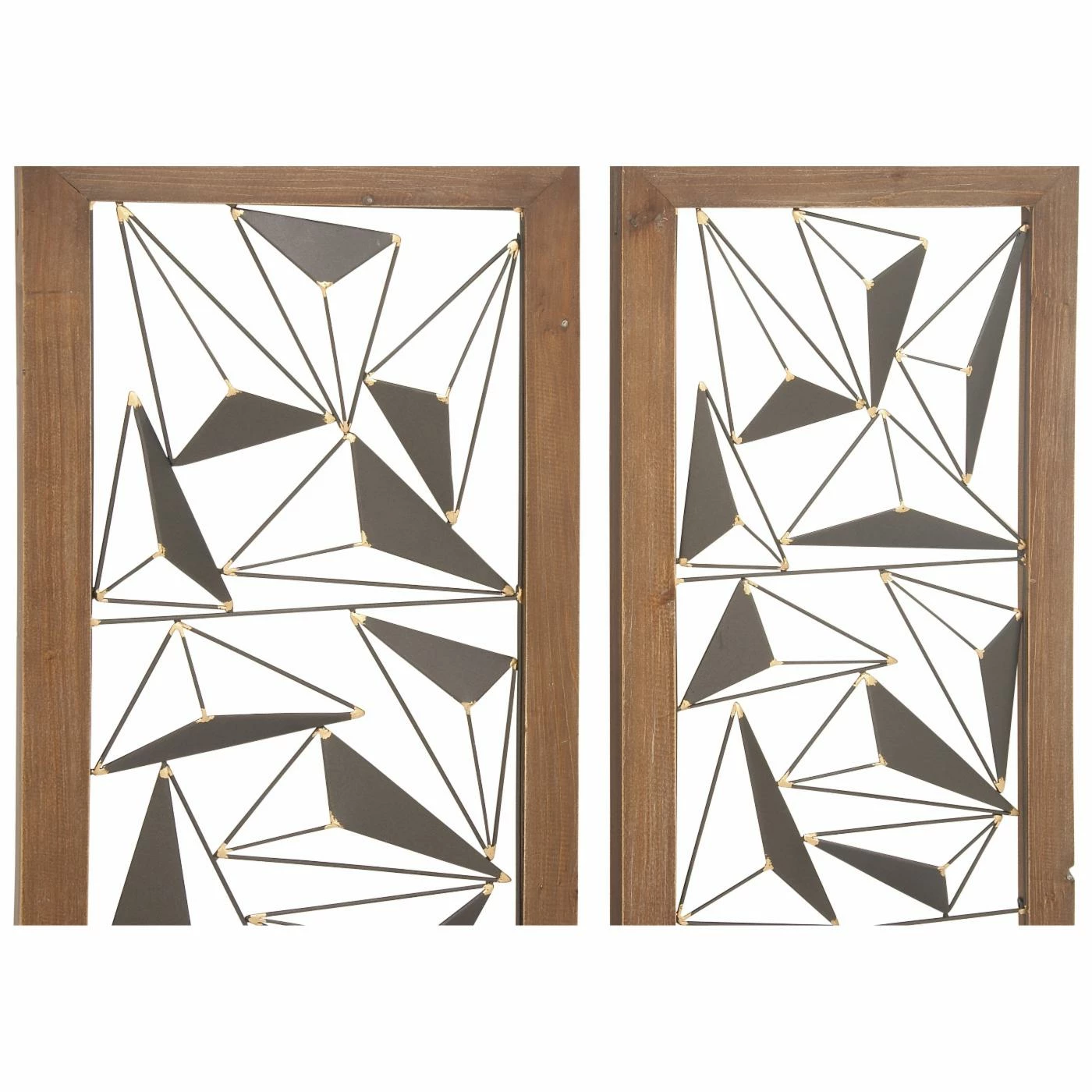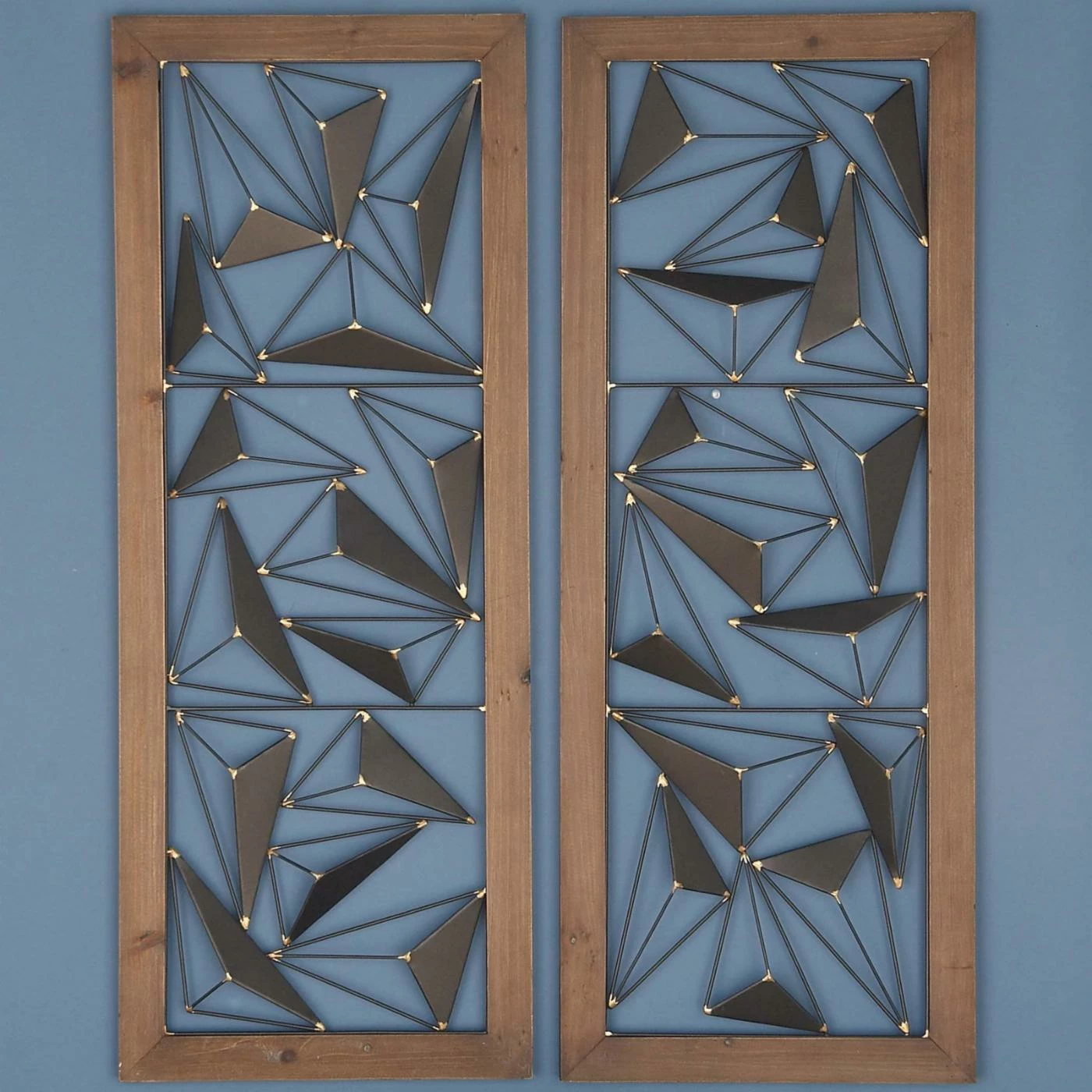 Bring double the modern industrial flair to your dรฉcor with the DecMode Prism Wood and Metal Wall Decor – Set of 2. Iron sheet metal and wire triangles fill the two fir wood frames, creating an abstract geometric design. Gold soldering enhances the rugged look of the wall panels.