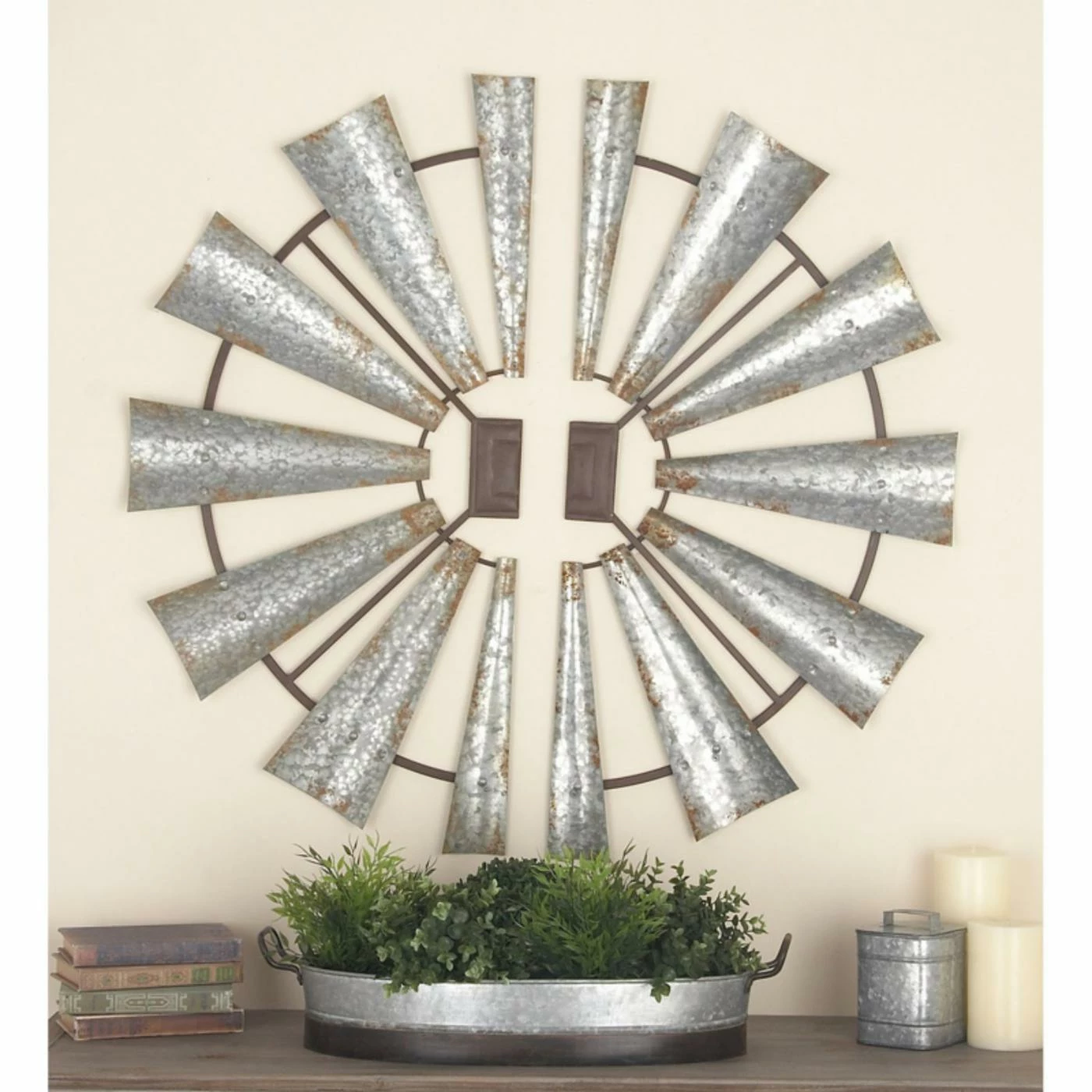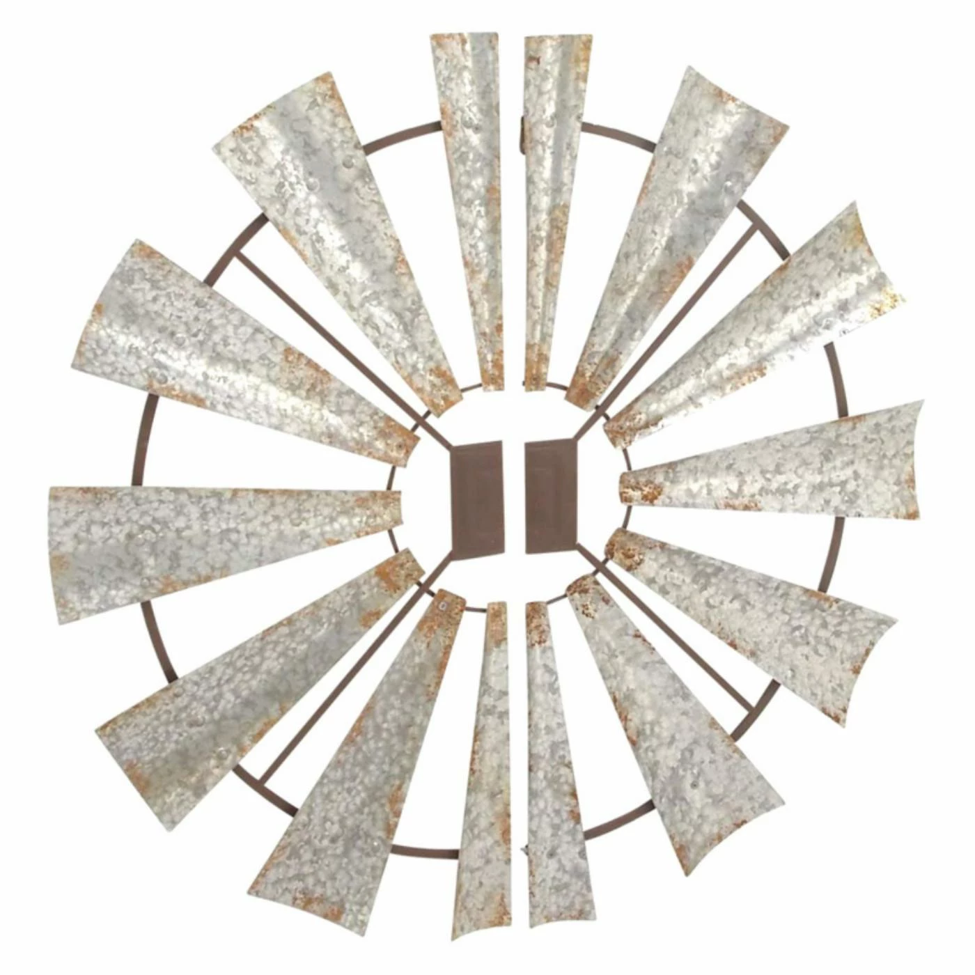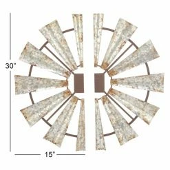 Inspired by a vintage windmill, the DecMode Round Metal Wall Sculpture – Set of 2 garners true shabby chic appeal. Made from metal in your choice of available size, this set of two sculptures comes together to create a rustic look enhanced with a gray and rust finish.