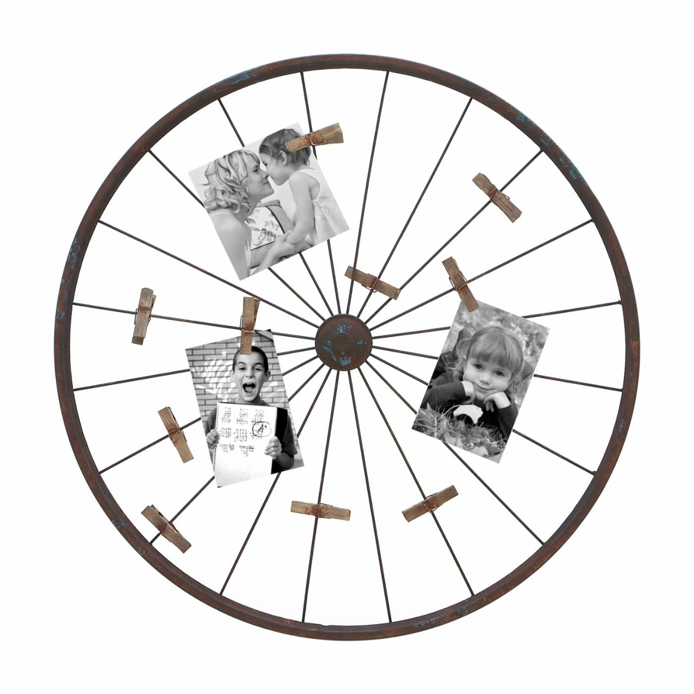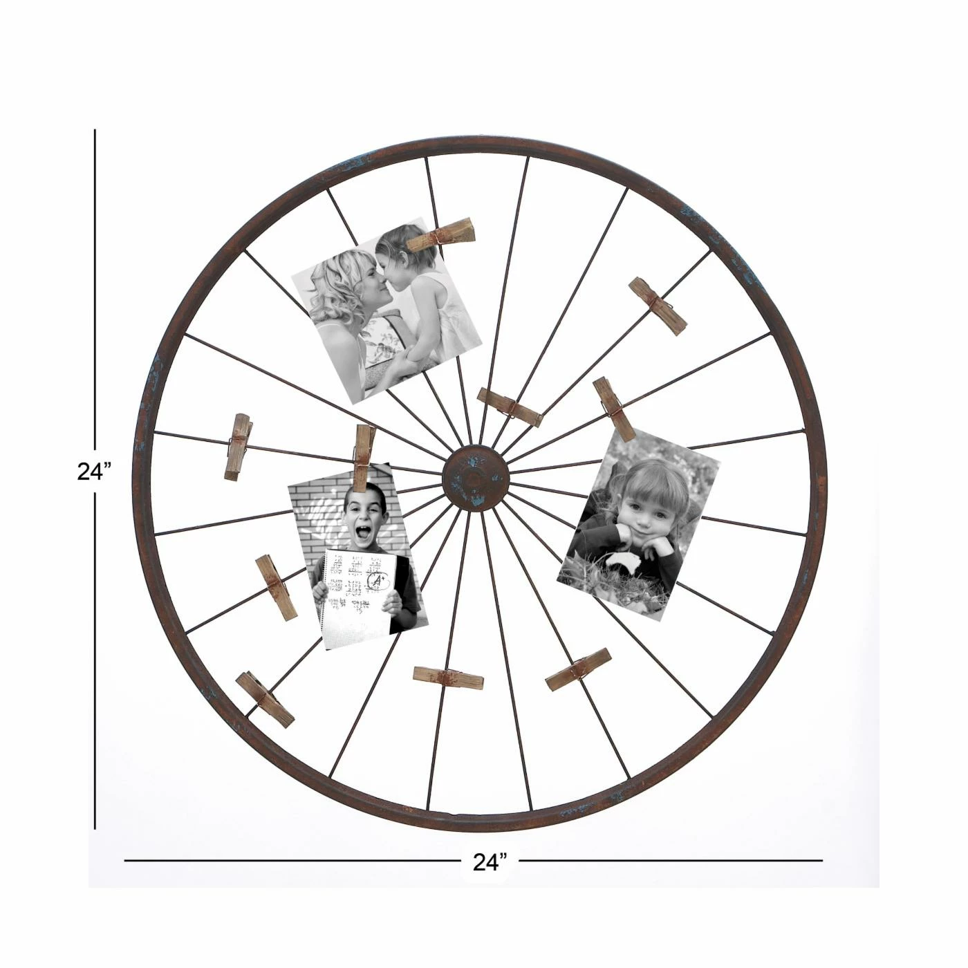 The DecMode Rustic Black Metal Bike Wheel-Inspired Photo Holder Wall Decor displays your favorite photos with vintage-inspired flair. It resembles an antique bicycle rim and boasts durable iron construction with intentionally rusted finish. Simply clip your photos onto the spokes for a tailored display you can add to at any time.