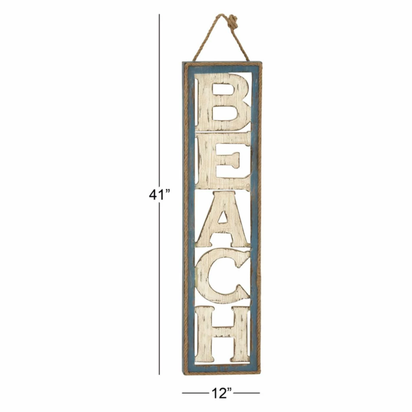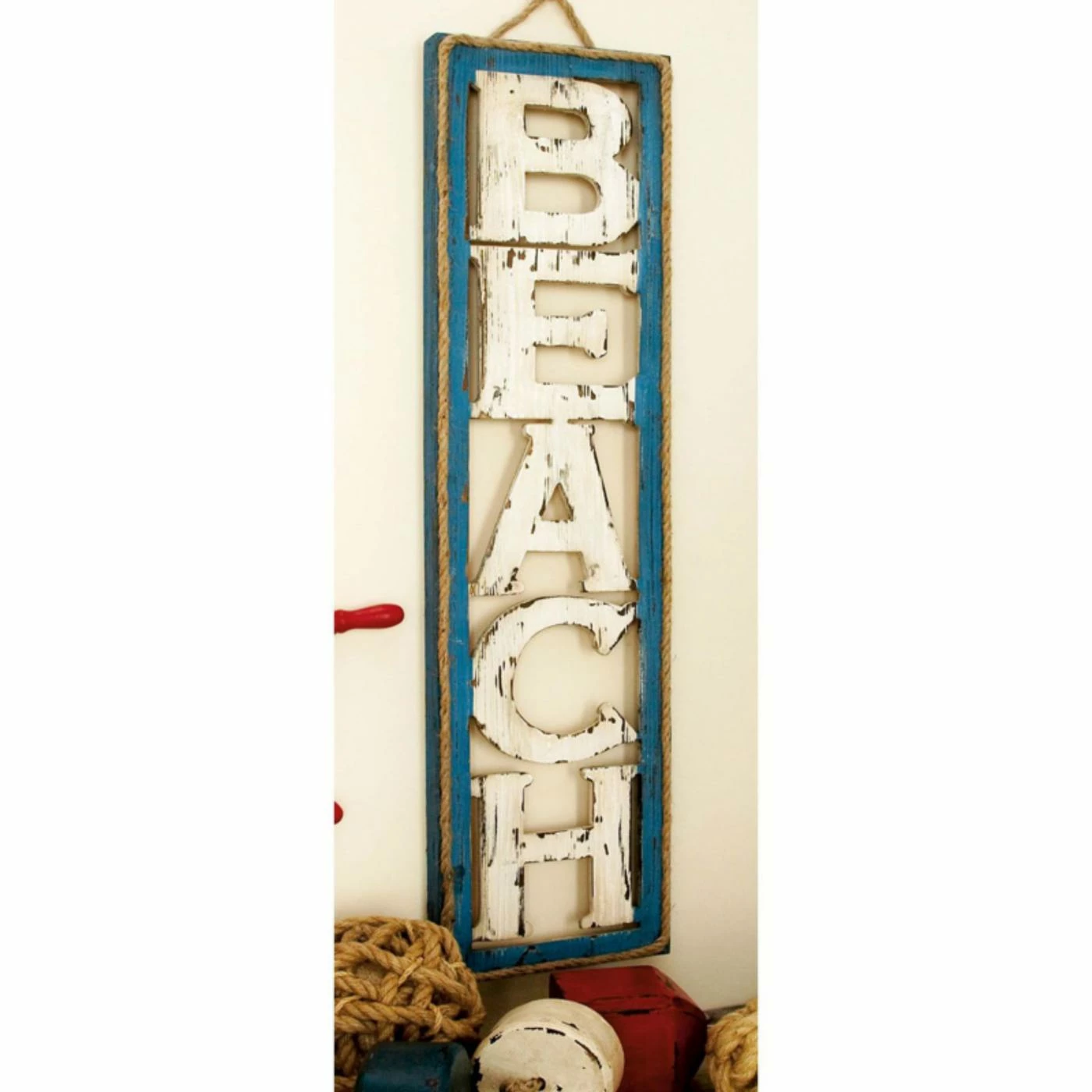 Weathered sandy beige letters on this DecMode Wooden Wall Sign spell out: beach. A rustic turquoise frame and rope border enhance the beachy charm of this wall sign.