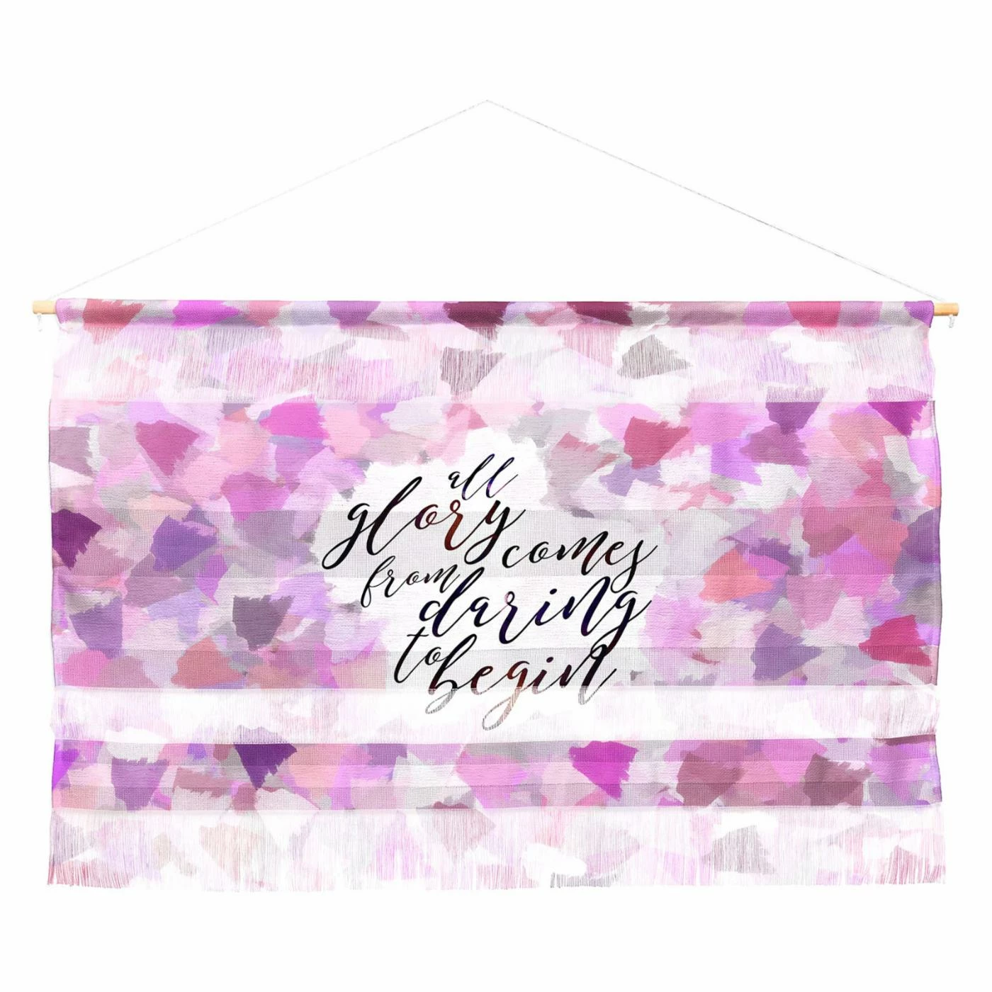 A pink and purple abstract and inspirational script make the Deny Designs Hello Sayang Daring to Begin Wall Hanging just what your bedroom dΓ©cor needs. The artwork is printed onto woven polyester, giving this wall hanging its vivid color and smart style. You’ll love the different textures, fringe detail, and how easy it is to hang this fiber art piece over your bed or on any wall. It comes in your choice of available size.