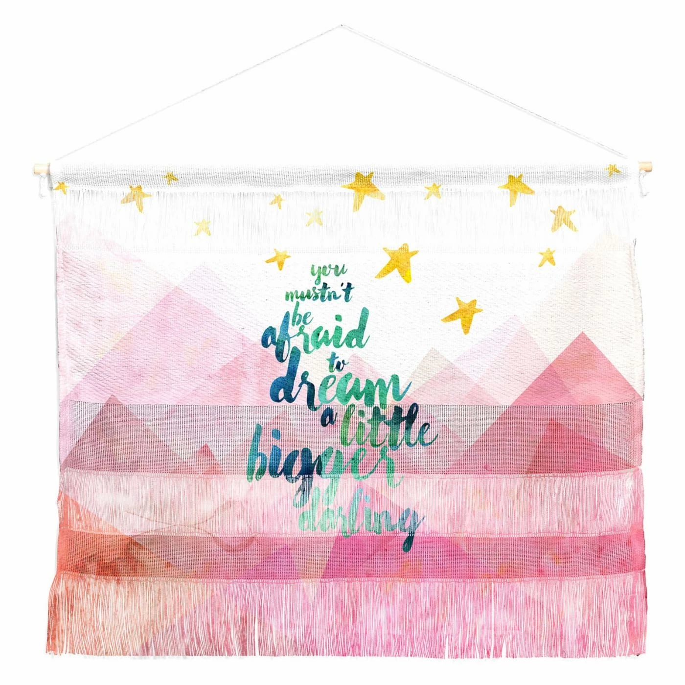 With the Deny Designs Hello Sayang You Mustnt Be Afraid To Dream A Little Bigger Darling Wall Hanging prominently displayed, you’re sure to stay motivated. Pink watercolor mountains and a bold message are printed onto woven polyester, giving this wall hanging its chic style and vibrant color. Love the textures, fringe, and how easy it is to style this fiber art piece on any wall. Choose from the available sizes.