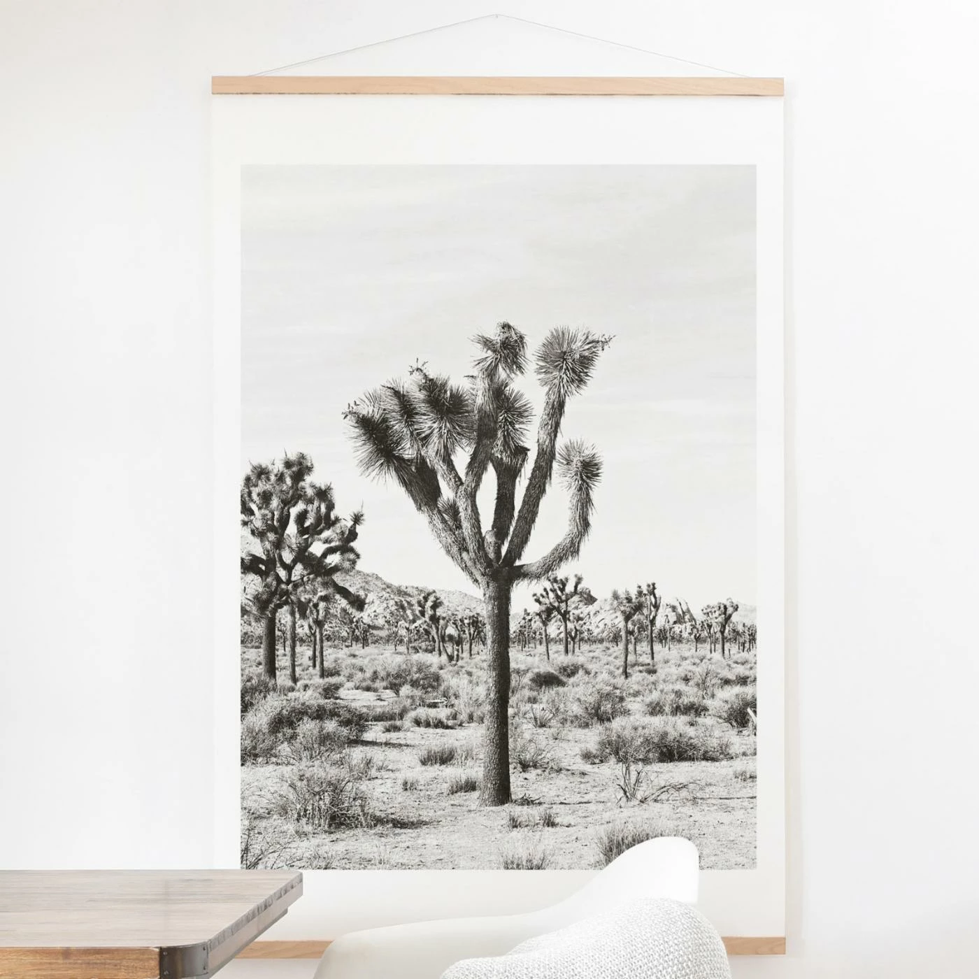 Give your desert dΓ©cor a modern update when you hang the Deny Designs Joshua Trees Wall Scroll. This print on canvas features a simple, black and white color scheme enhanced by the natural finish of the wood base.