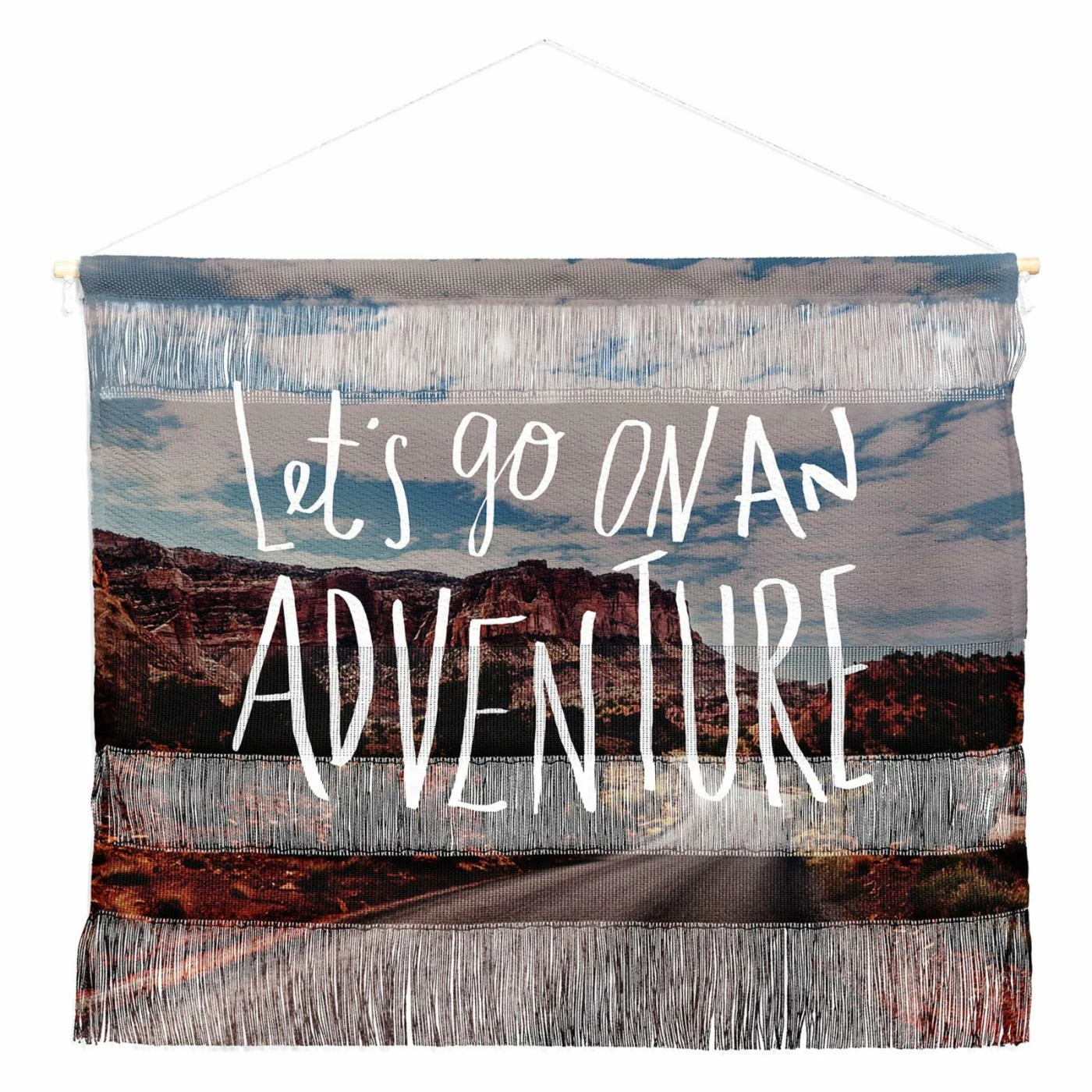 Find your sense of adventure wherever you display the Deny Designs Leah Flores Adventure Utah Wall Hanging. Leah Flores’ photograph and text are printed onto woven polyester, giving this wall hanging its bold color and adventurous style. You’ll love the different textures, fringe detail, and how easy it is to hang this wall art piece. It comes in your choice of available sizes.