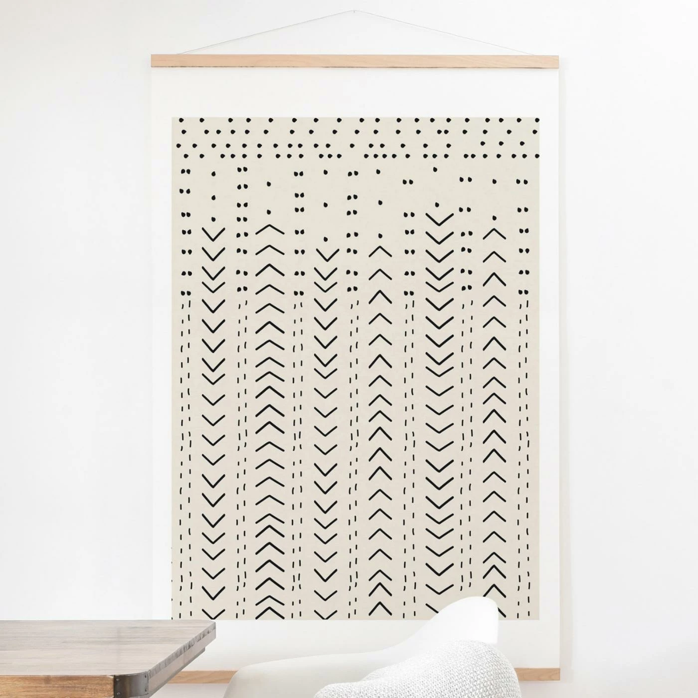 Give your home a modern update by displaying the Deny Designs Mud Cloth Inspo Viii Wall Scroll. This print on fiber paper offers a geometric design with a warm beige background. The natural wood base arrives ready to hang using the included hardware.