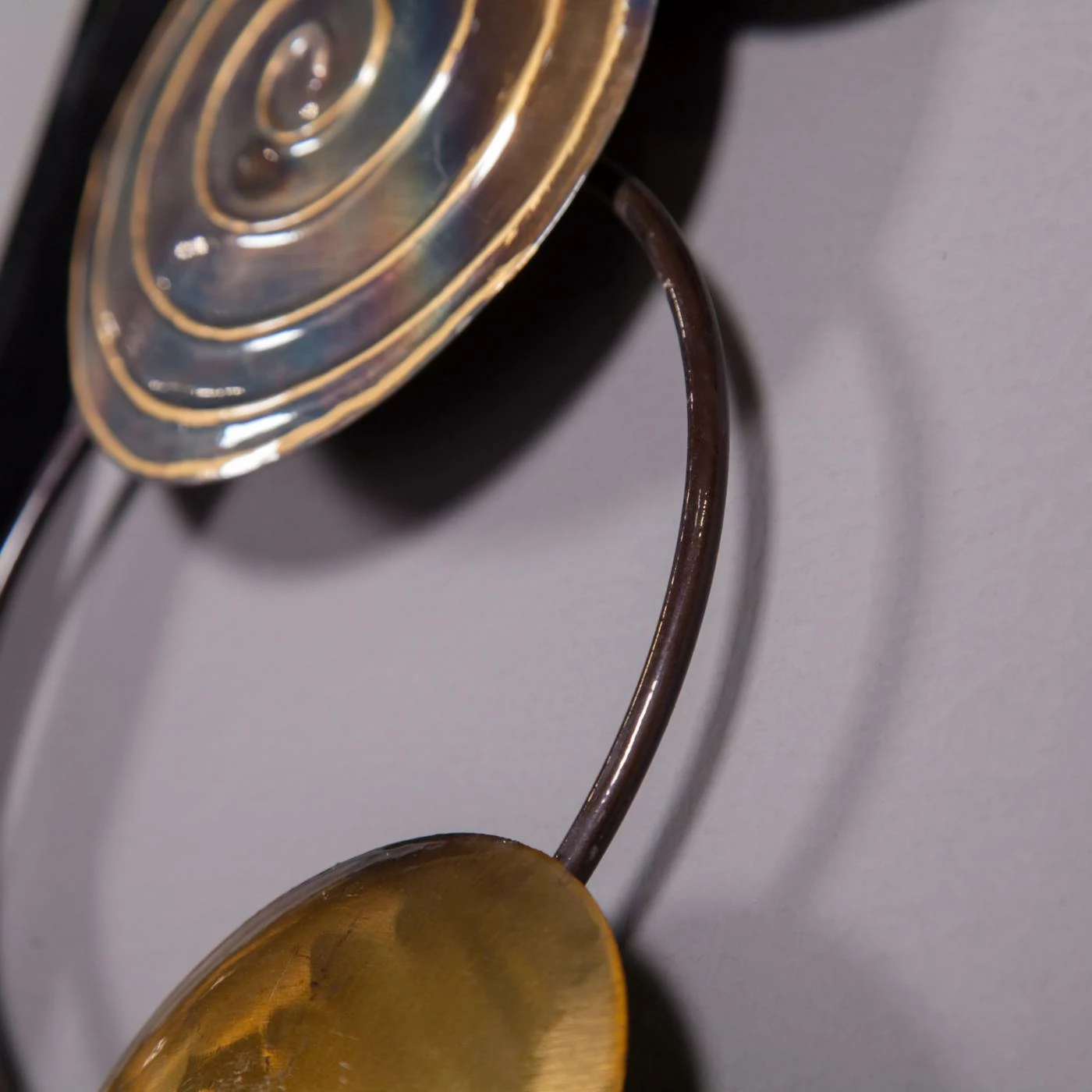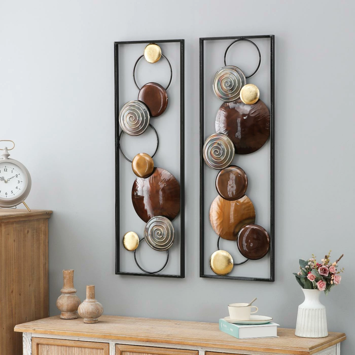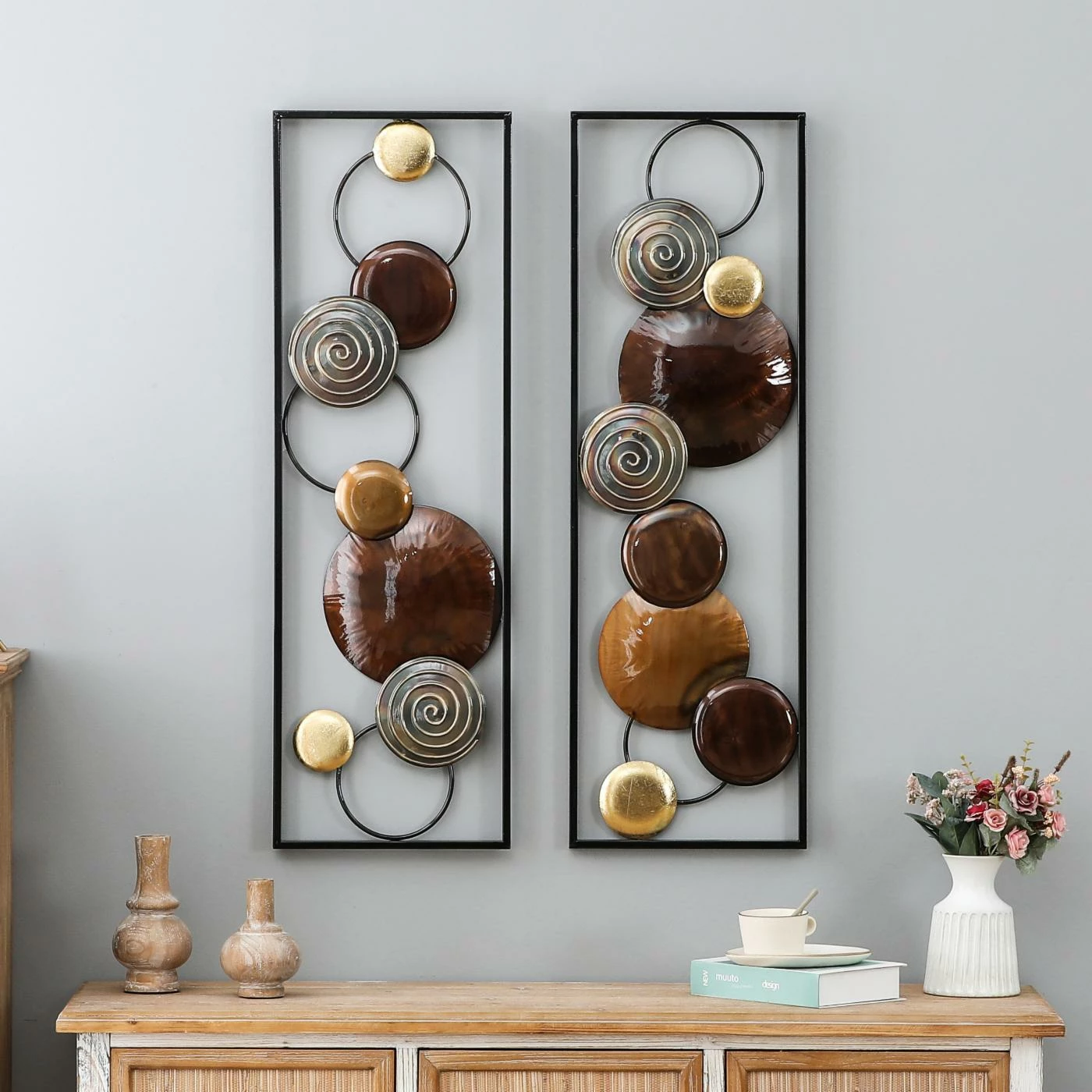 Crafted from metal, the LuxenHome Circular Abstract Metal Wall Sculpture – Set of 2 boasts a heavy feel and premium quality construction. This wall sculpture set features warm brown and gold hues that blend well with a variety of decorative styles, making it a versatile addition to your home or office setting.