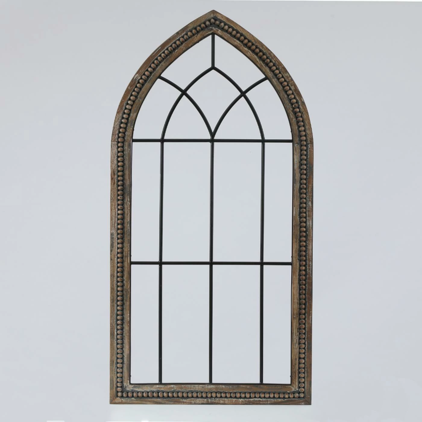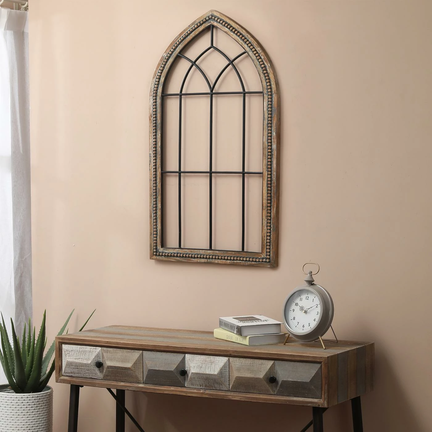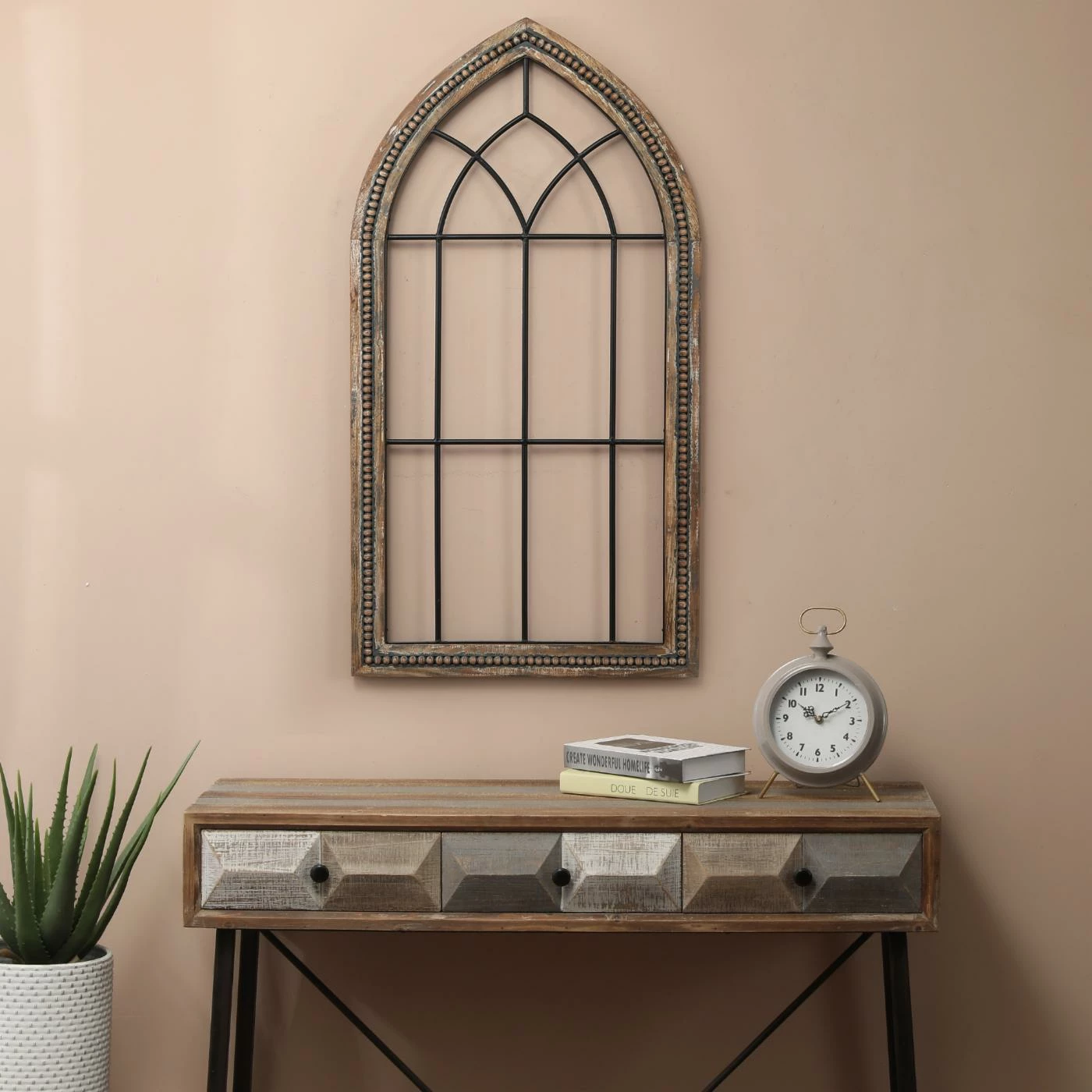 Bring a touch of sophisication to your home with this LuxenHome Distressed Wood and Metal Cathedral Wall Decor. This lovely cathedral shaped wooden wall decor features an arched window design made from fir wood. The wood wall window frames a stunning, contrasting black iron inside. The wood frame has decorative wood beads lining the entire frame. The cathedral wood window is perfect for hanging anywhere in your home.