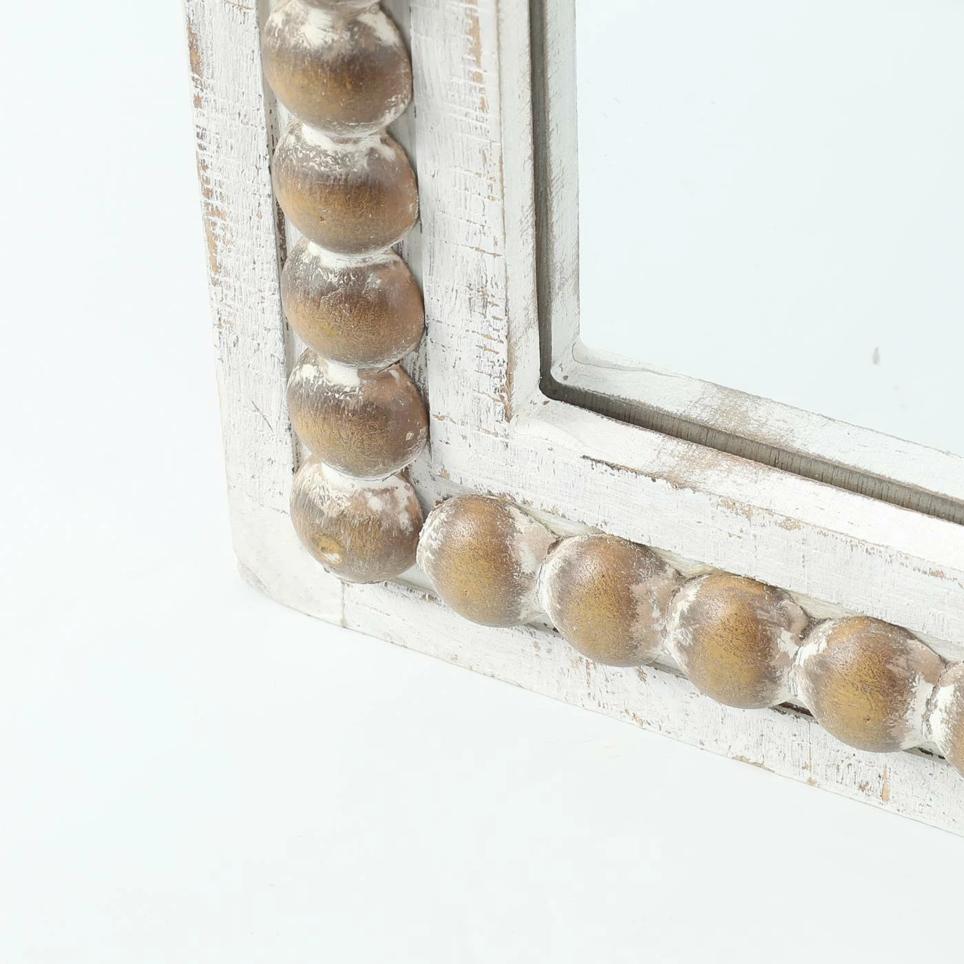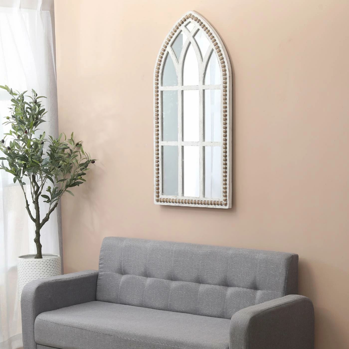 - Distressed white finish frame is arched window shape