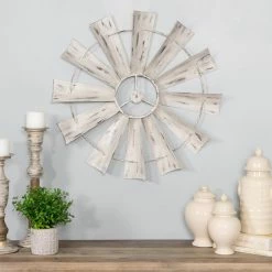 Add rustic charm to your space with the Aspire Home Accents Celeste Windmill Wall Decor. This wall accent is crafted from iron and shaped to resemble windmill blades. This piece features a versatile, distressed white finish that will work well in a wide range of settings.