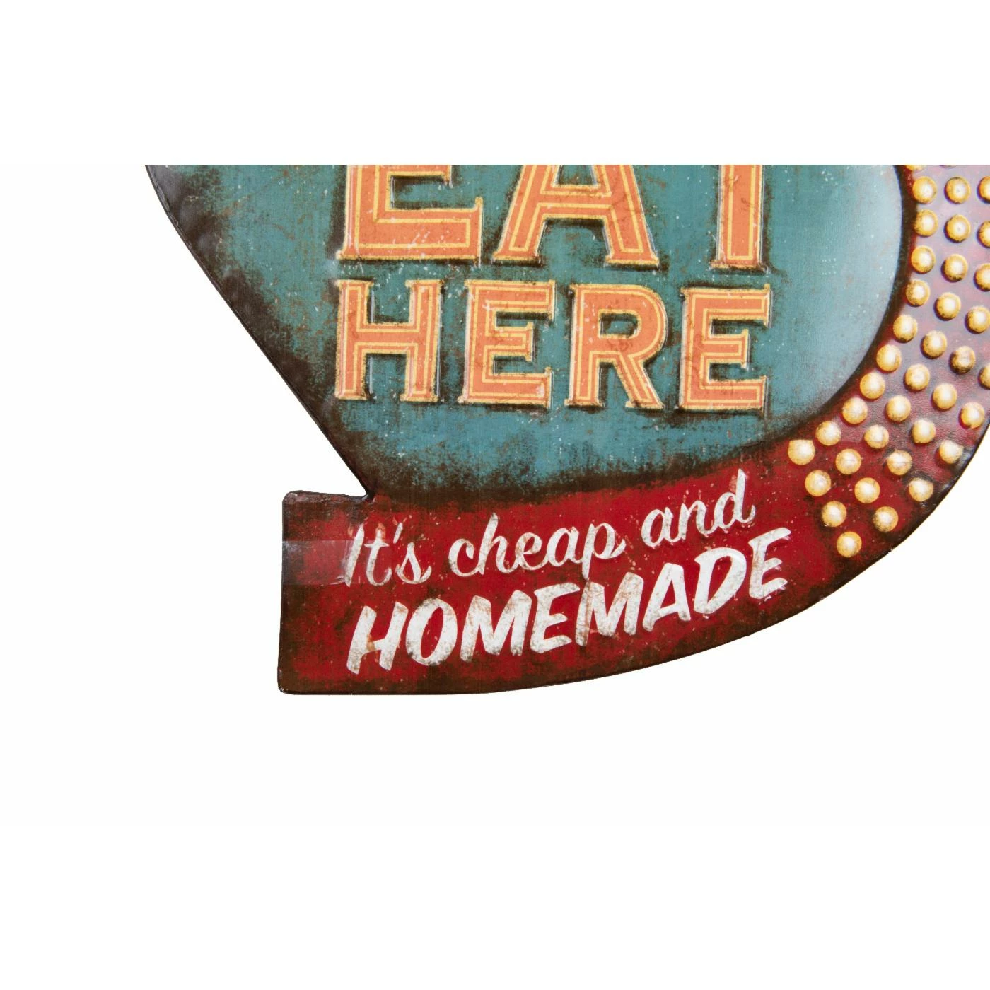 Delight your family members and put a smile on guestsβ faces with this wonderfully retro wall decor. Inspired by classic 50s Americana and old diners that used to dot the sides of highways the country over, this charming design showcases a swooping red arrow fitted with yellow faux-lightbulbs around a teal sign displaying the words: βEAT HERE.β Made from tin and distressed for a vintage, antiqued look, this piece showcases a keyhole hanger for easy installation. To establish a farmhouse chic aesthetic in your open concept, eat-in kitchen, mount this sign over a slatted wooded banquette by a brightly-lit window in the corner. Set the table with a galvanized steel pail full of freshly-cut calla lilies as a floral centerpiece for any occasion, then install a repurposed mason jar pendant light overhead to wash the room in a quaint country glow.
