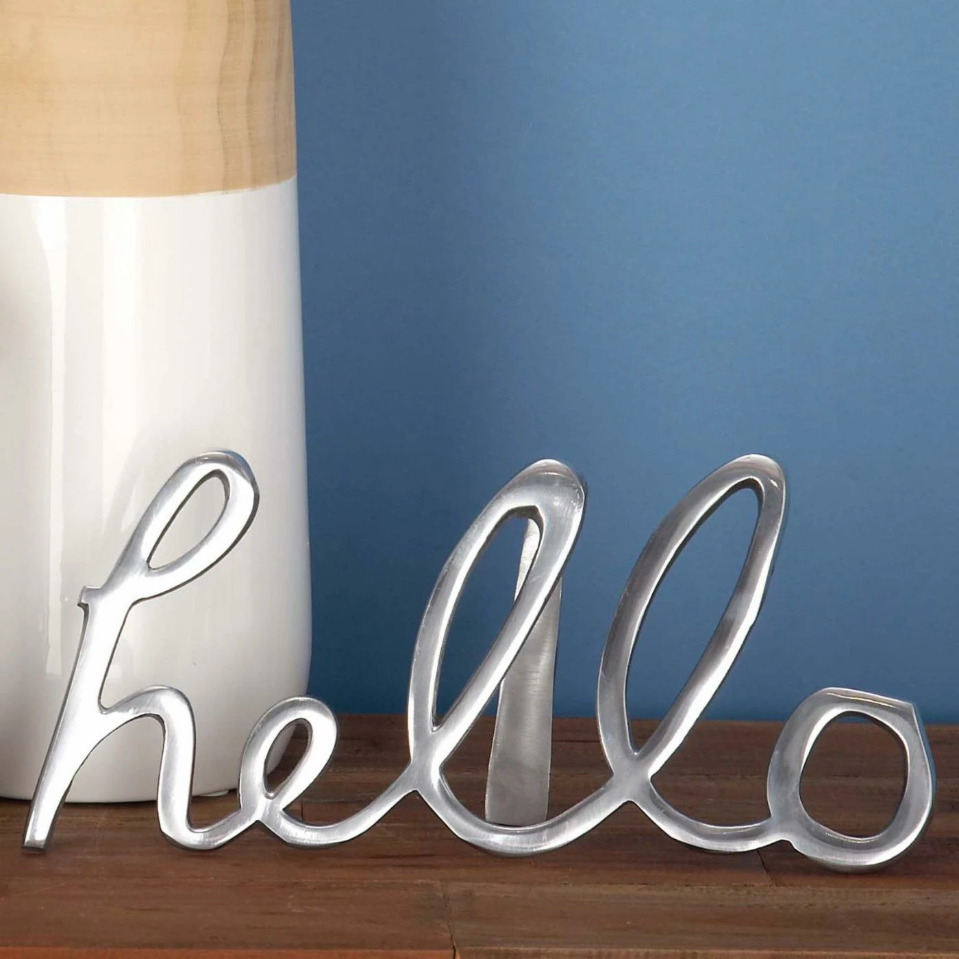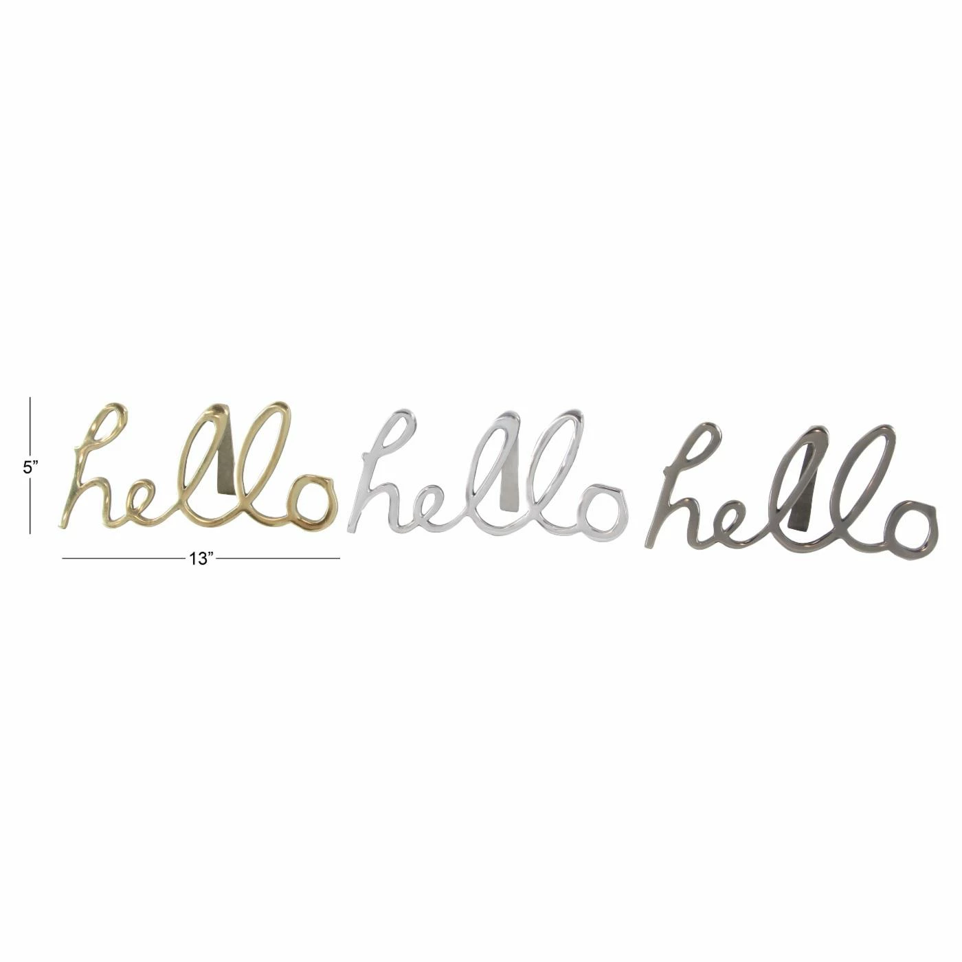 Say it three ways with the DecMode Aluminum Hello Wall Signs – Set of 3. This set includes three aluminum wall signs that each say ‘hello.’ One in polished gold, one in polished silver, and one in polished gray. Rod hangers at the back make it easy to display these hello signs wherever you choose to be extra friendly.