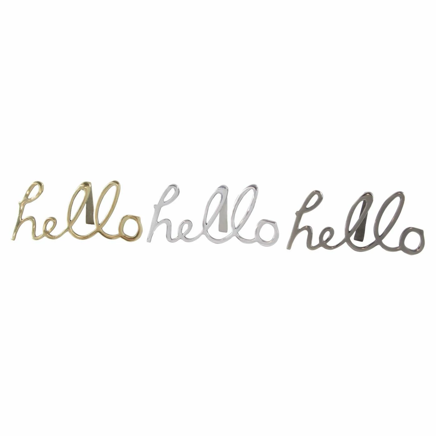 - Hello script in 1 of each color: gold, gray, and silver