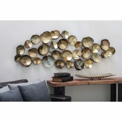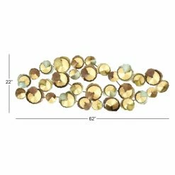 This DecMode Gold and Patina Serrated Circles Wall Sculptures – 62W x 22H in. features interlocking discs in tarnished gold, brass, and copper. Pie-shaped semicircles are stacked atop jagged-edge circles and attached by a wire frame. Fill any empty space with this unique abstract wall art.