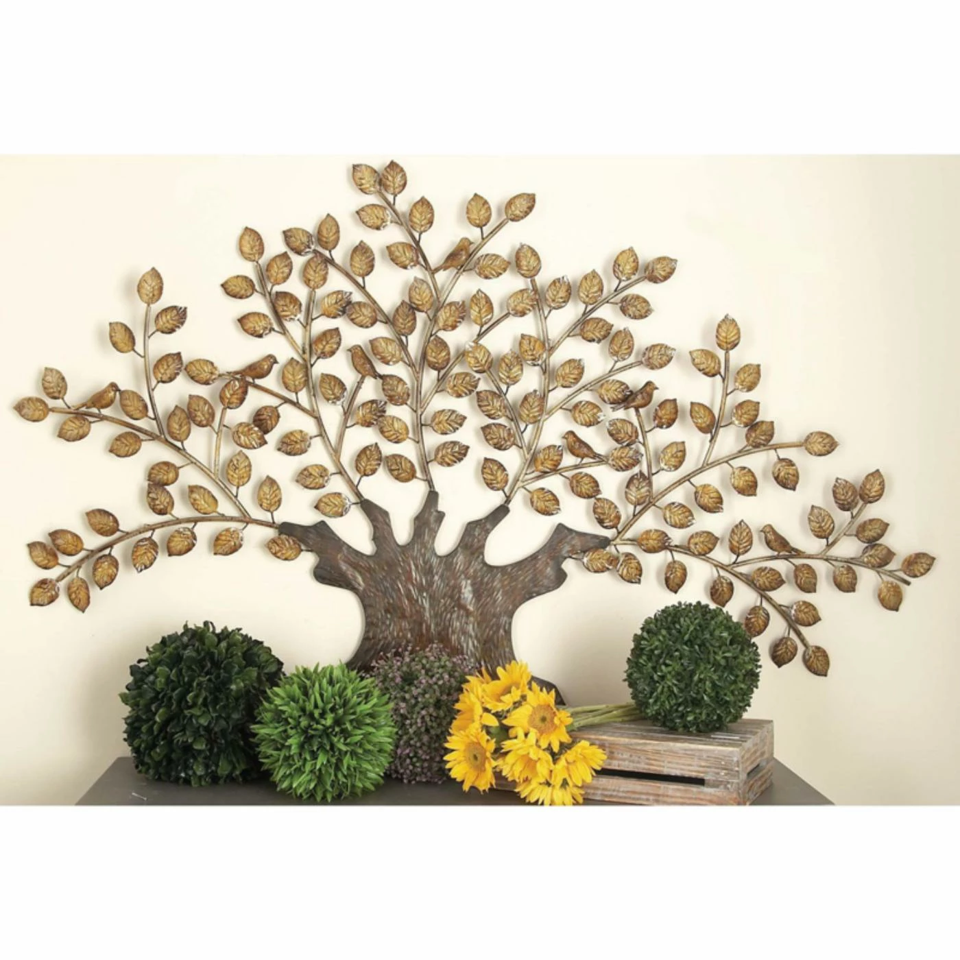 The DecMode Outspread Tree Wall Sculpture helps you bring the great outdoors inside with a large tree-shaped sculpture made of durable iron. This charming work of art features leafy branches, and small bird silhouettes are dotted throughout the design.