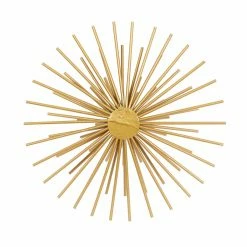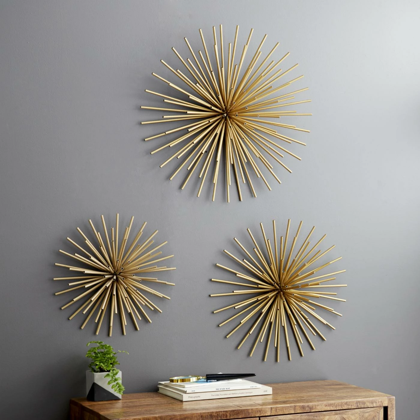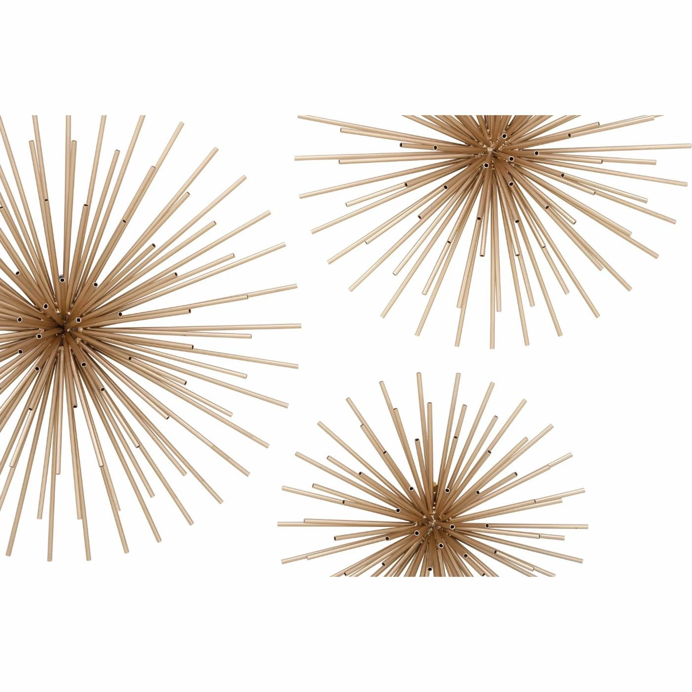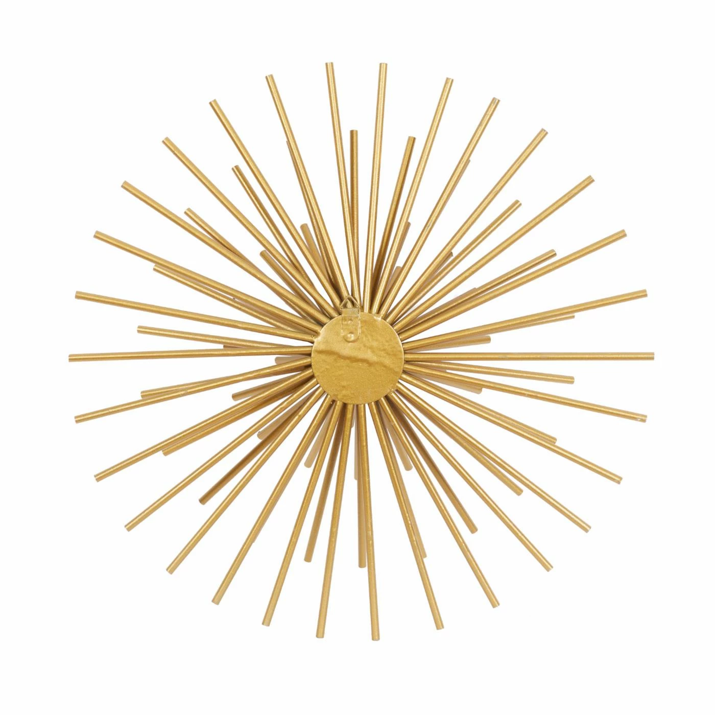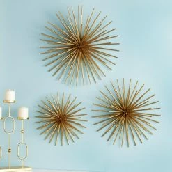 The DecMode Radial Pattern Wall Sculpture – Set of 3 appears to burst from your walls with the striking radial sunburst design. Slender rods crafted of tin protrude from the center, while small metallic balls on the tips give the set of three wall sculptures a radiant shine.
