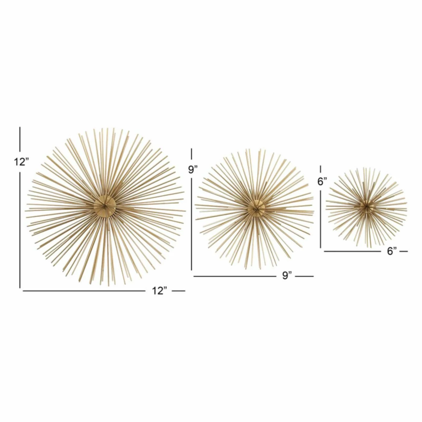 The DecMode Starburst Wall Sculpture – Set of 3 includes 6-, 9-, and 12-inch designs available in the finish of your liking. Each glamorous starburst ornament is crafted entirely of tough tin wire arranged around a flat center disc, creating a three-dimensional look. Each piece has a flat back with a keyhole opening to make hanging easy.