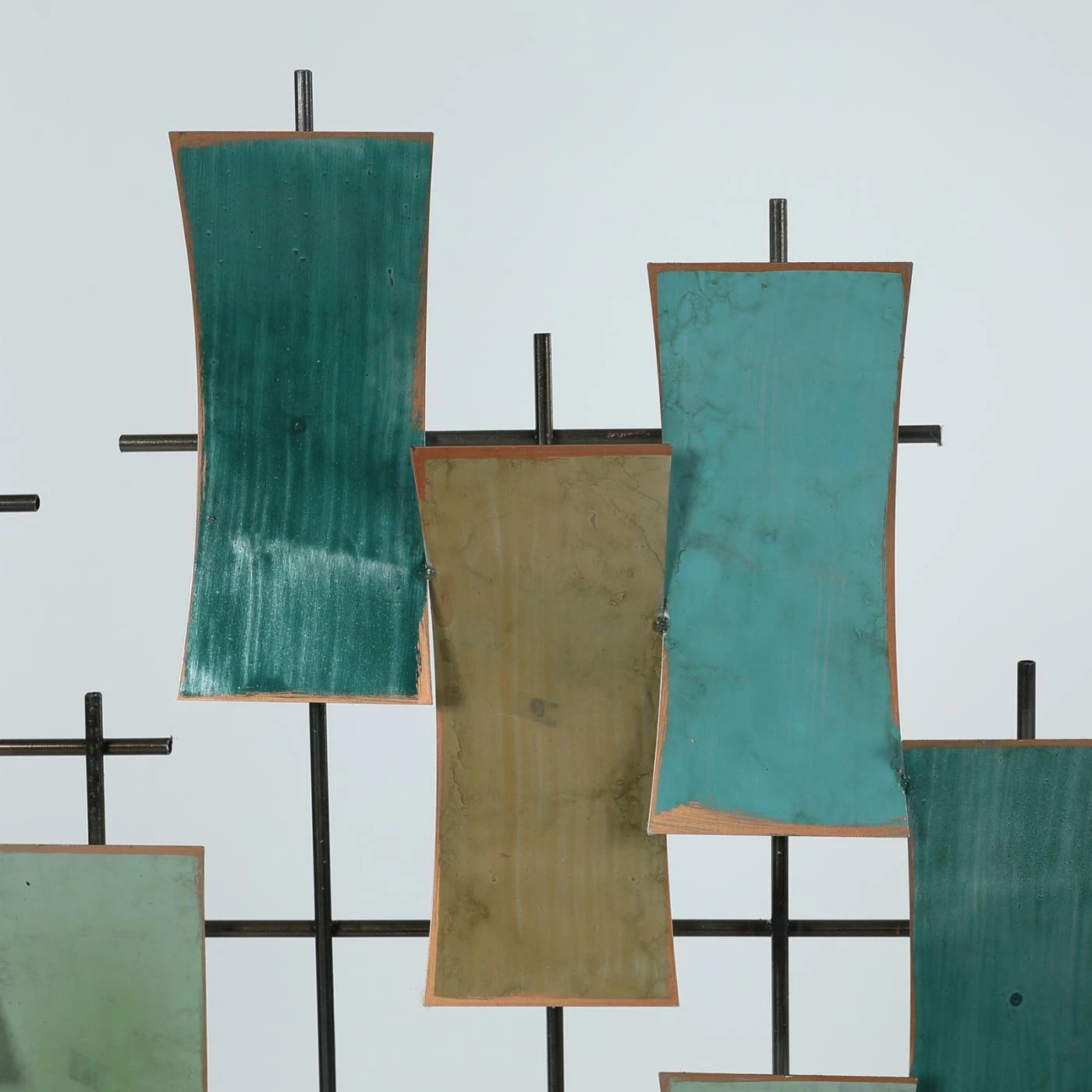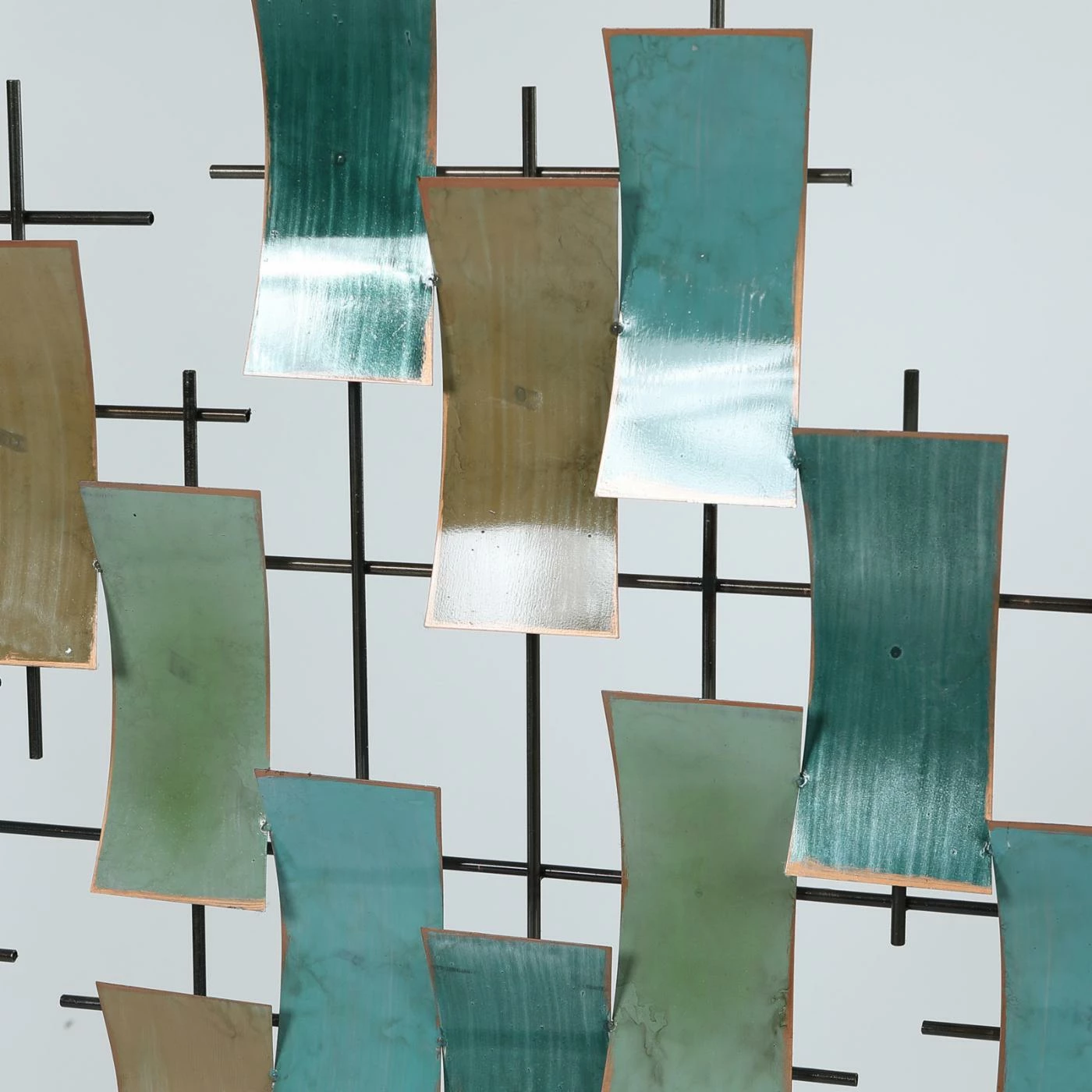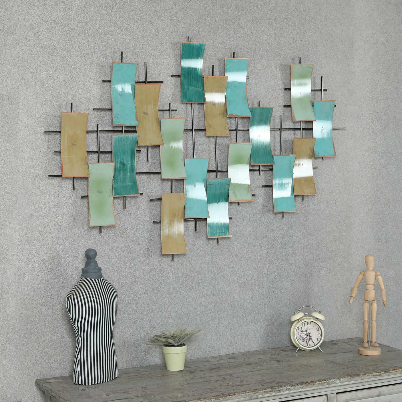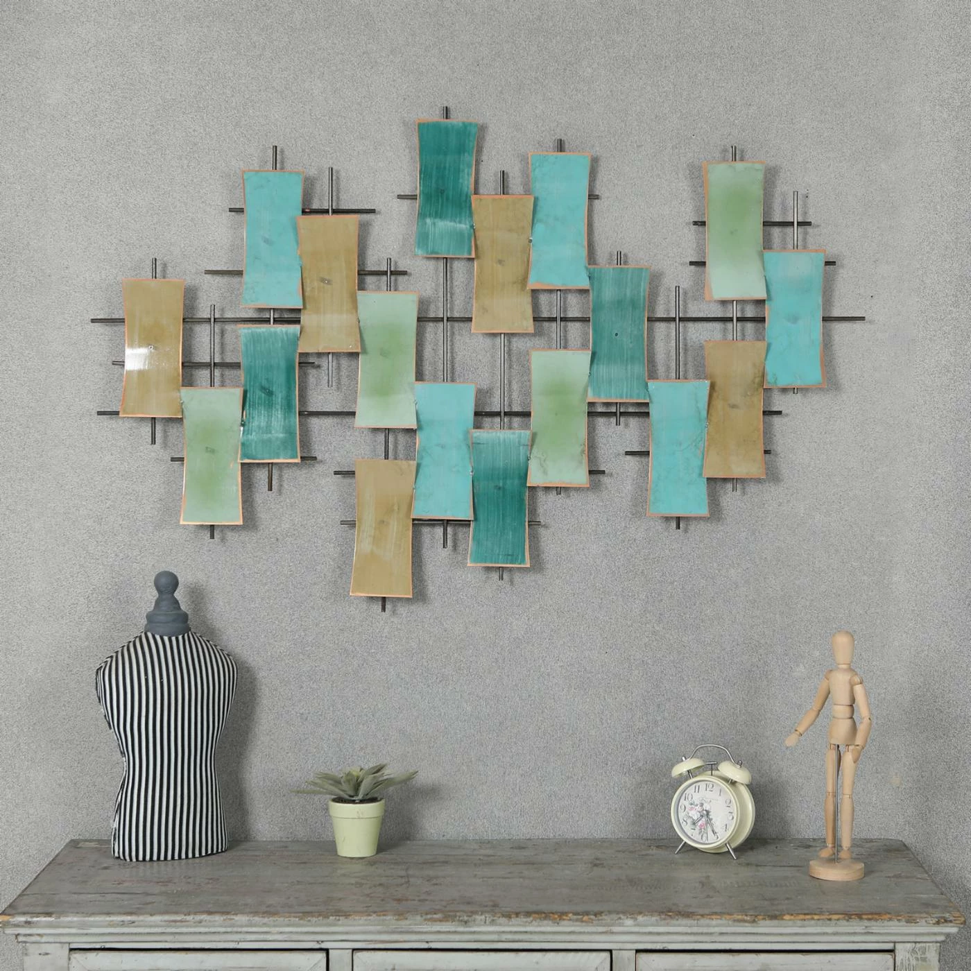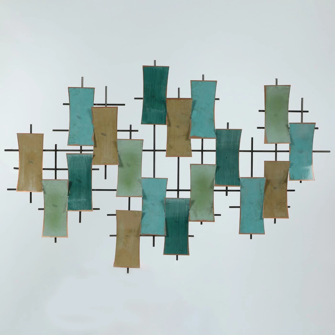 Give your living room or bedroom a charming update with the LuxenHome Abstract Rectangles Wall Sculpture. This piece of wall art features an iron grid with a number of concave-edged rectangular accents. Each rectangle is finished in a muted brown, teal, blue, or green tone with a distressed edge. All necessary hanging hardware is included. Display the piece vertically or horizontally.