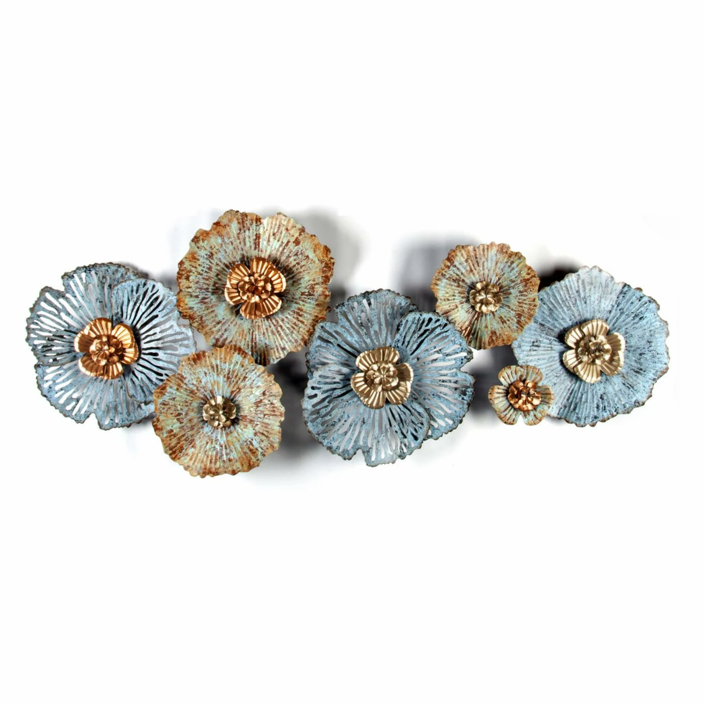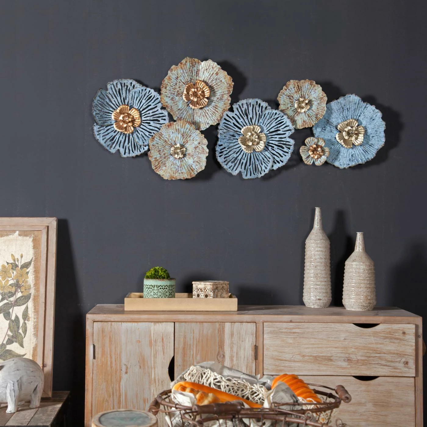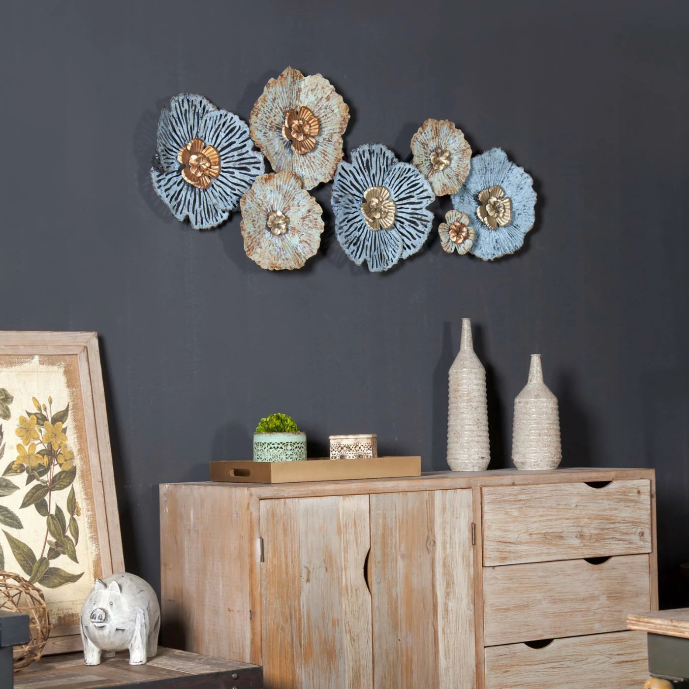 Add a rustic touch to your space with the LuxenHome Distressed Flower Wall Decor. This three dimensional sculpture is handcrafted from iron and features 7 flowers of various sizes in shades of distressed blue and gold. Hang it easily with the included hardware.