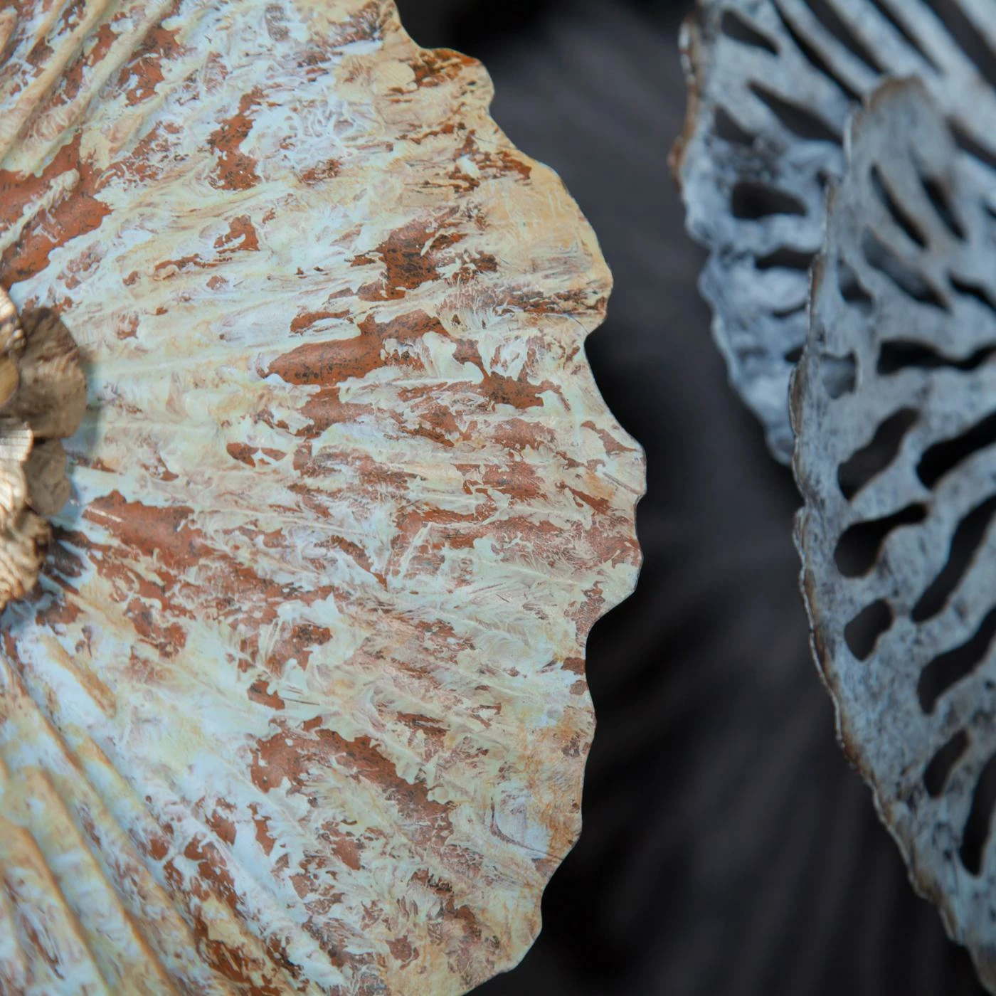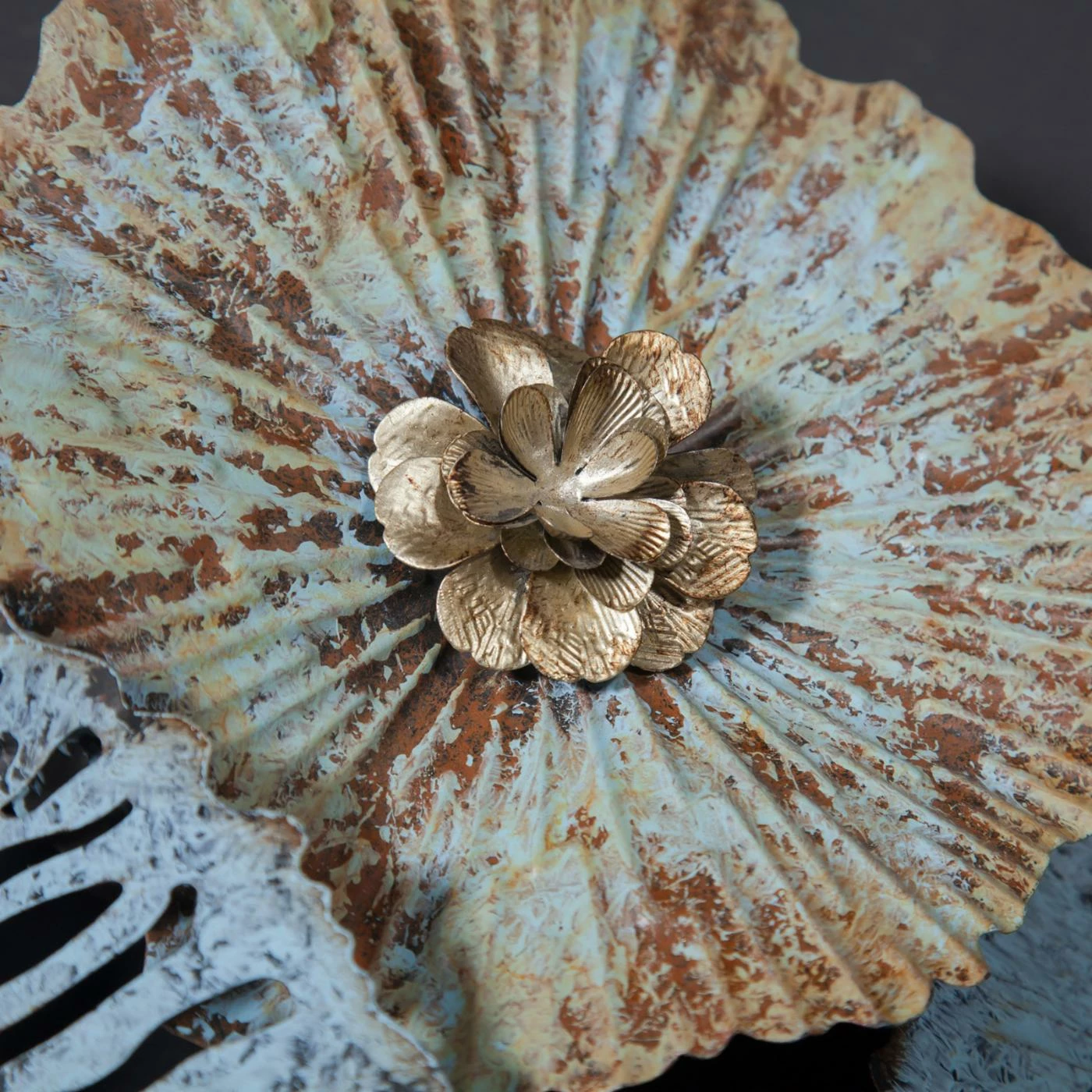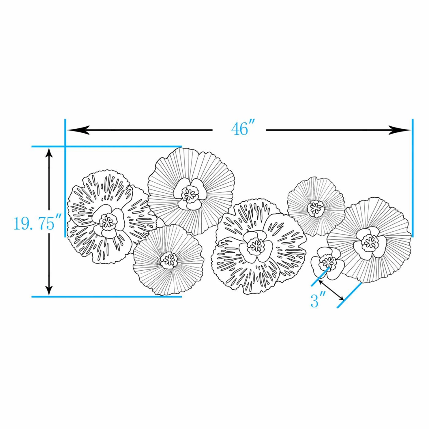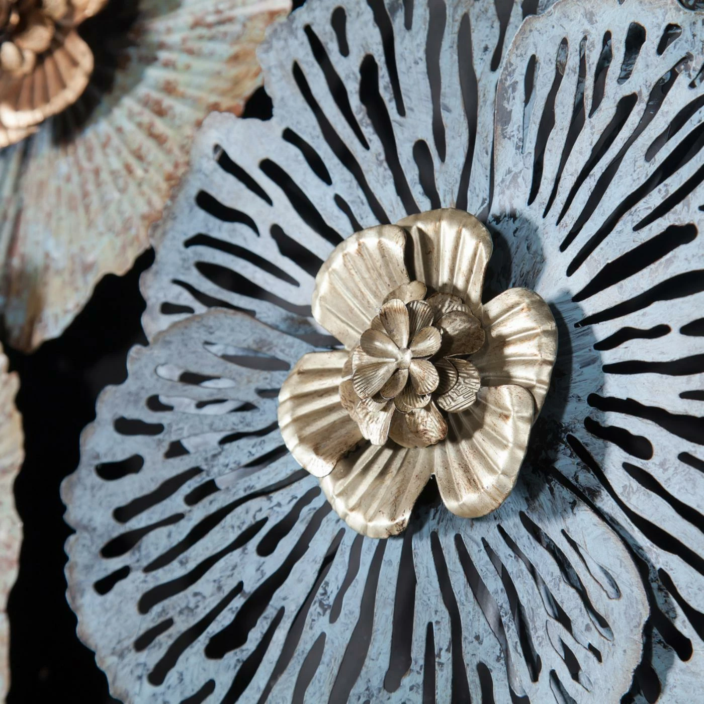 Add a rustic touch to your space with the LuxenHome Distressed Flower Wall Decor. This three dimensional sculpture is handcrafted from iron and features 7 flowers of various sizes in shades of distressed blue and gold. Hang it easily with the included hardware.