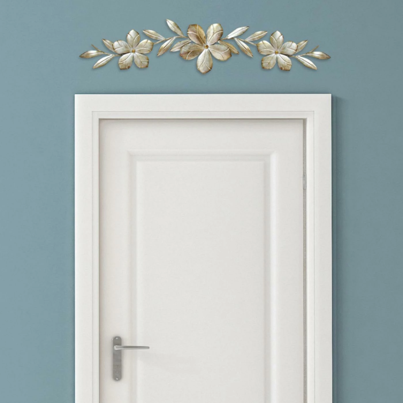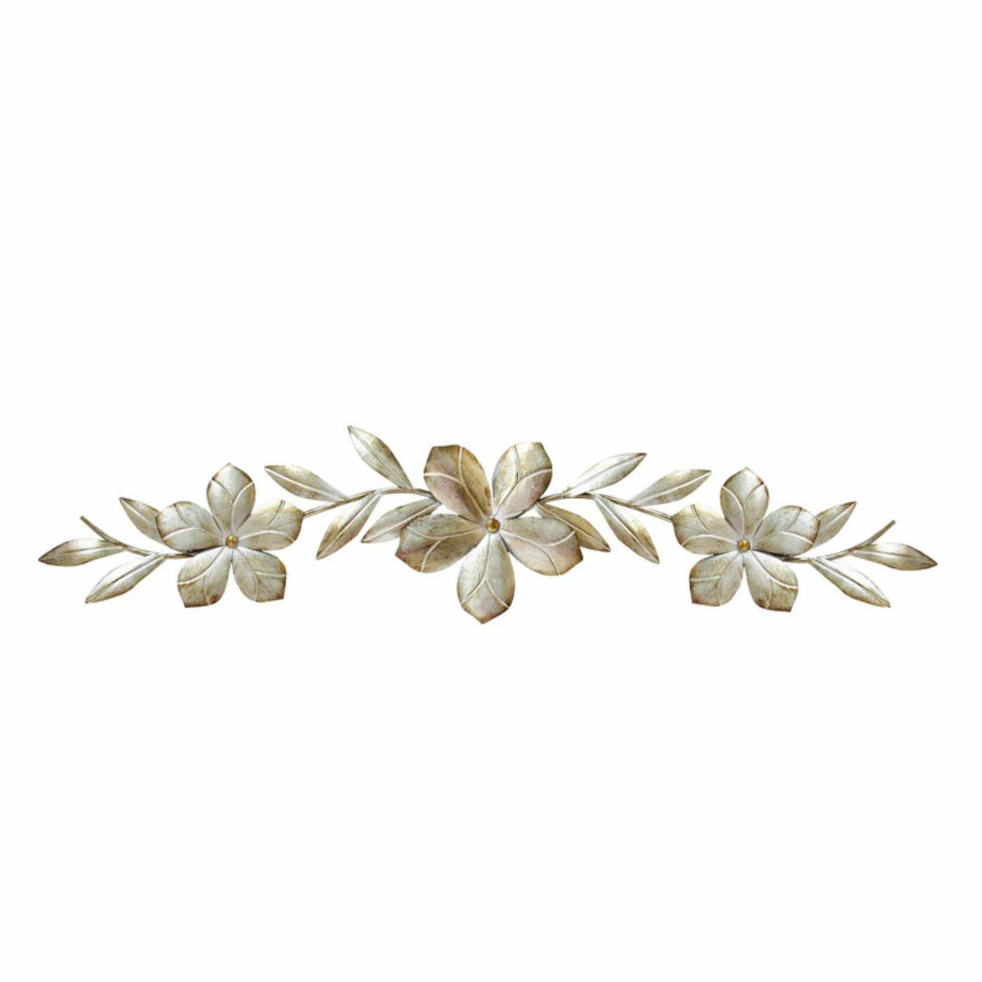 Adorn the entrance to your bedroom or foyer with the Stratton Home Decor Champagne Flower Over the Door Wall Sculpture, which features a light, glistening champagne finish. This softly arched wall sculpture is crafted from sleek and robust metal and features three blossoms, surrounded by leafy accents with a richly textured look.