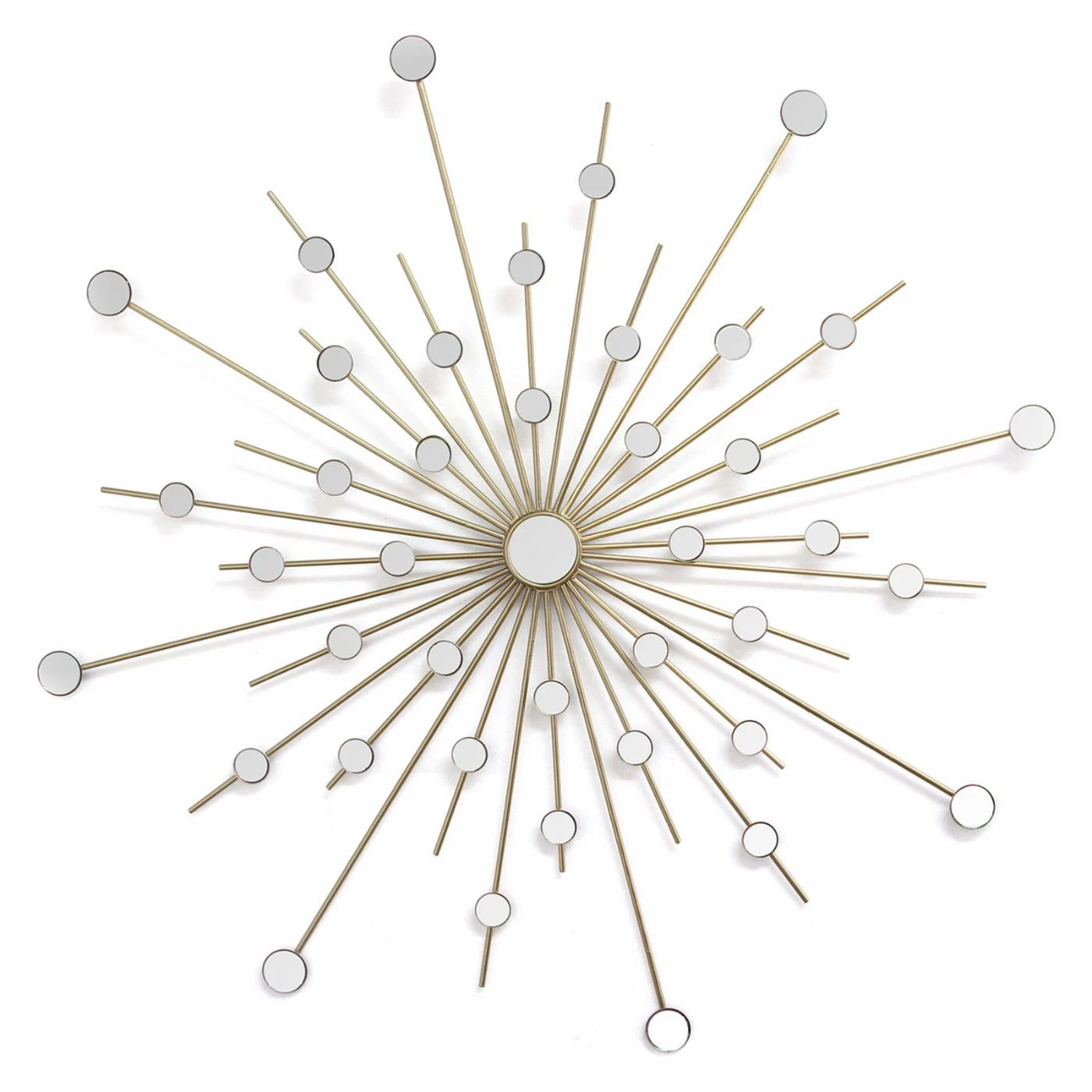 Brighten up that drab wall over your couch or above a shelf with the funky, modern design of the Stratton Home Decor Sparkle Mirror Burst Wall Decor. This wall sculpture features a metal sunburst shape with mirrored, circle accents. Choose from available metallic finishes. This wall decor is easily hung from one keyhole and can be cleaned with a damp cloth.