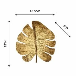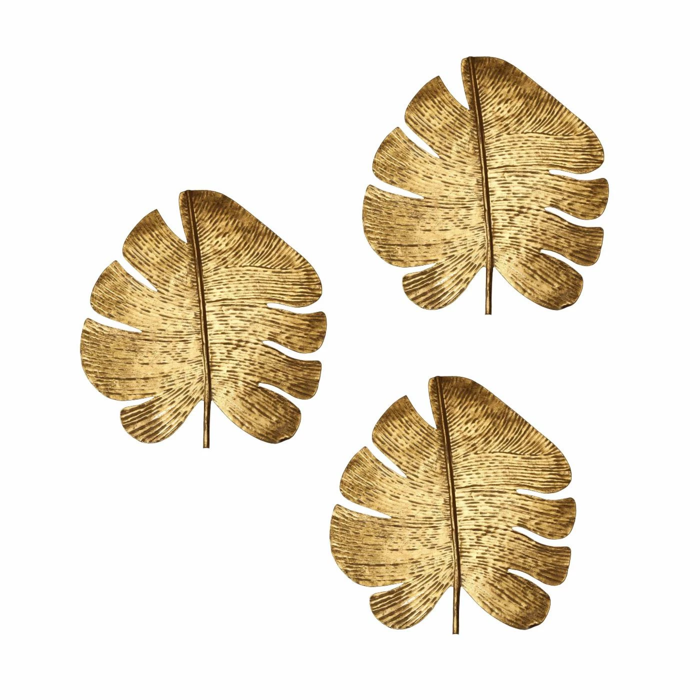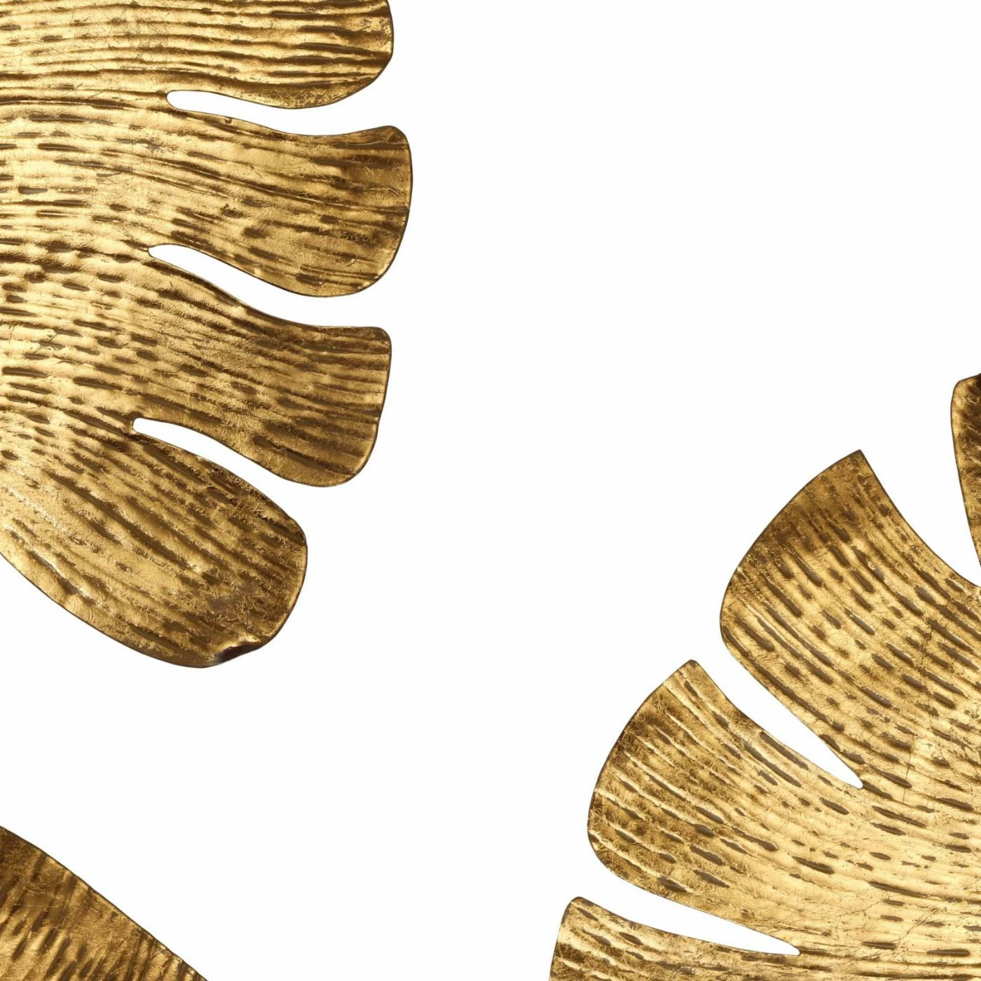 Create a lush, tropical-inspired getaway in your living room with the TOV Furniture Gold Leaf Wall Art – Set of 3, palm leaf wallpaper, and vintage rattan furniture. This wall art set includes three hand-hammered leaf sculptures made from molten iron and finished in a bright gold. Each piece is handmade by skilled artisans and hanging hardware is conveniently included.