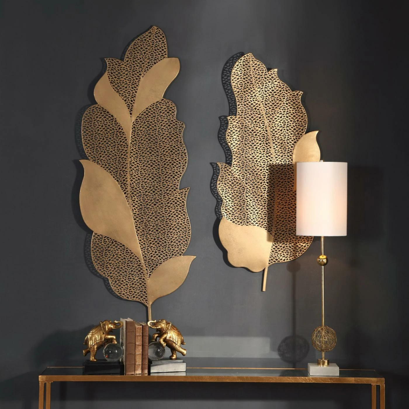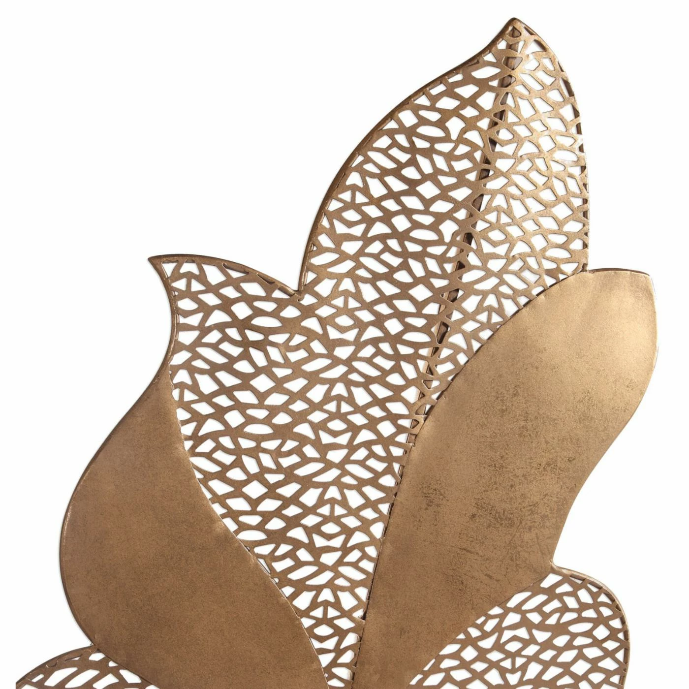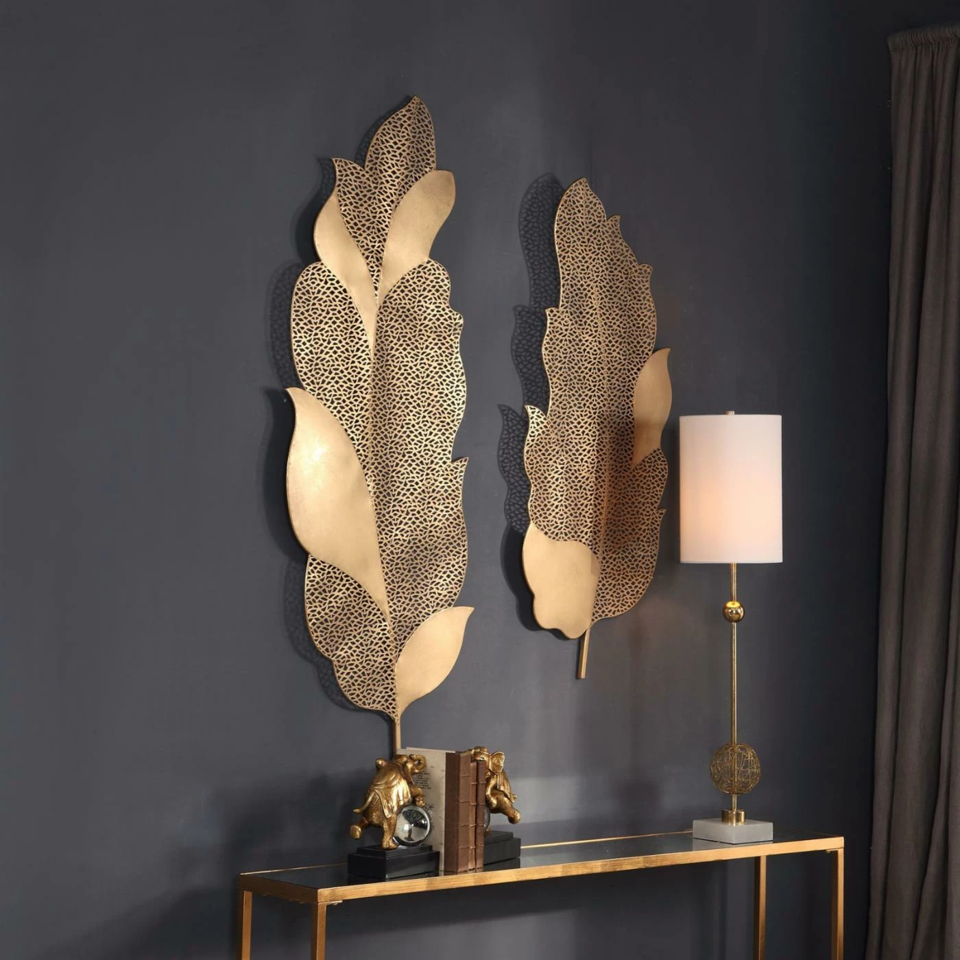 Intricate lace-like detail is cut into the Uttermost Autumn Lace Leaf Wall Art – Set of 2’s metal design. The whimsical feather shapes bring soft elegance to your wall. The softly gleaming gold finish gives this wall art a luxurious look.