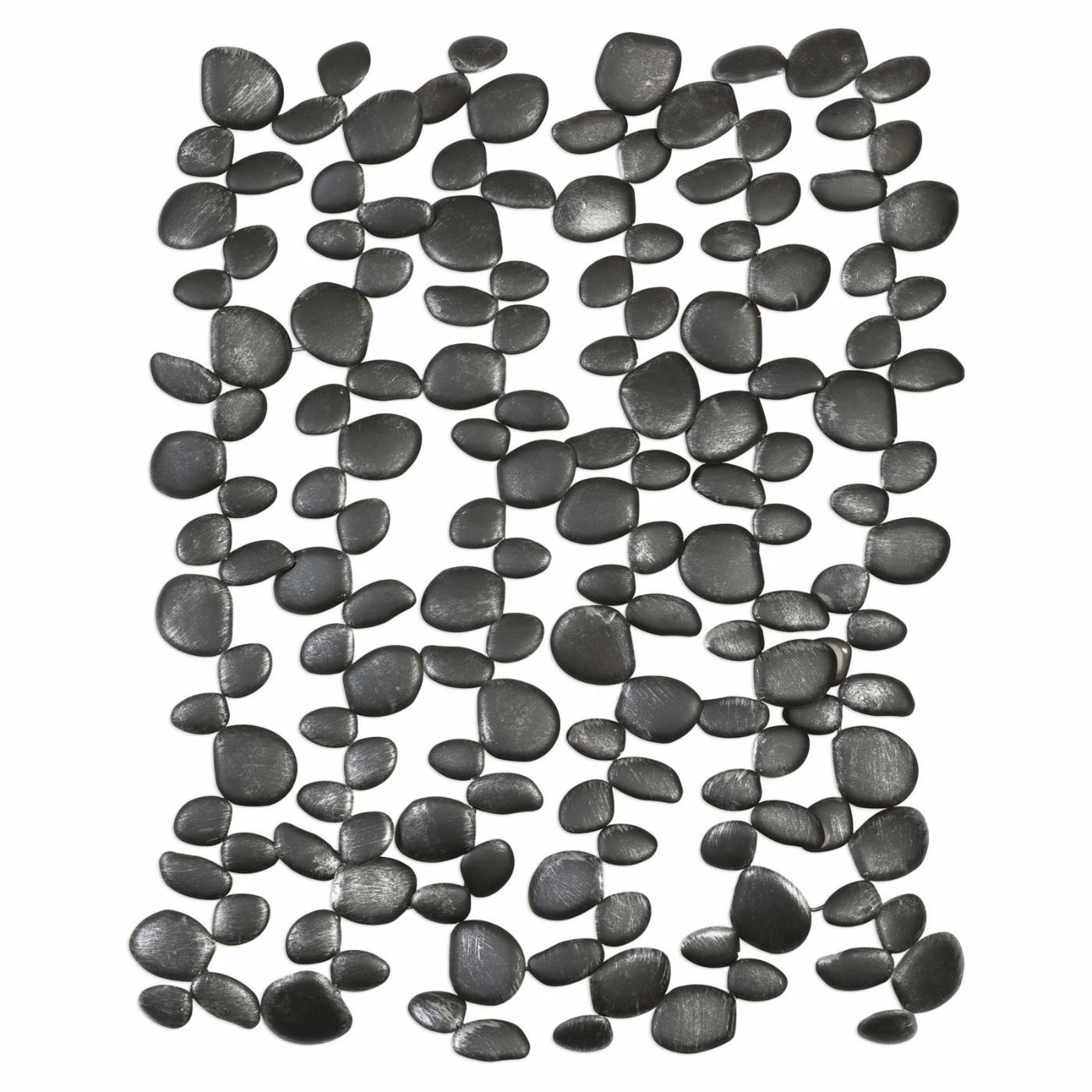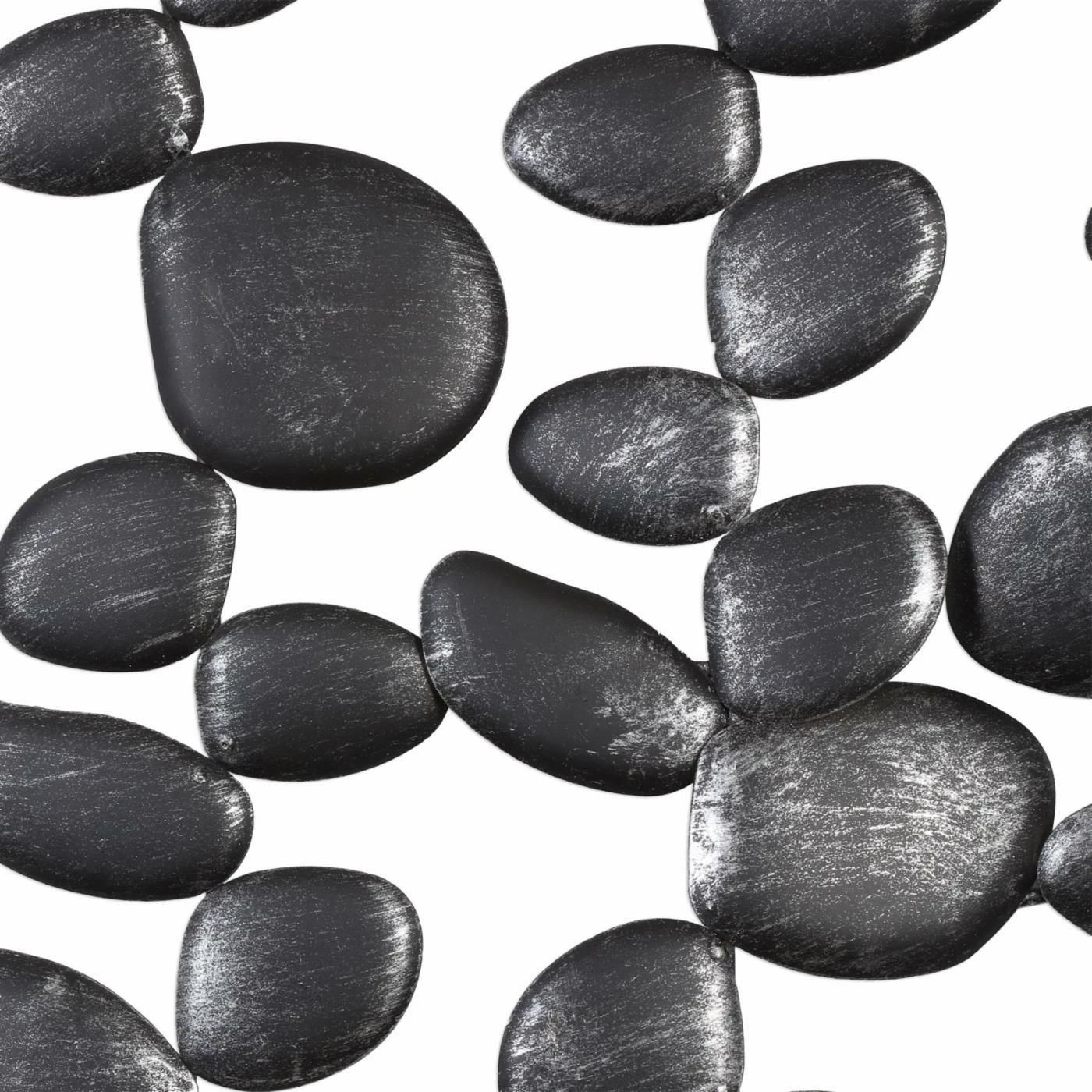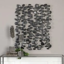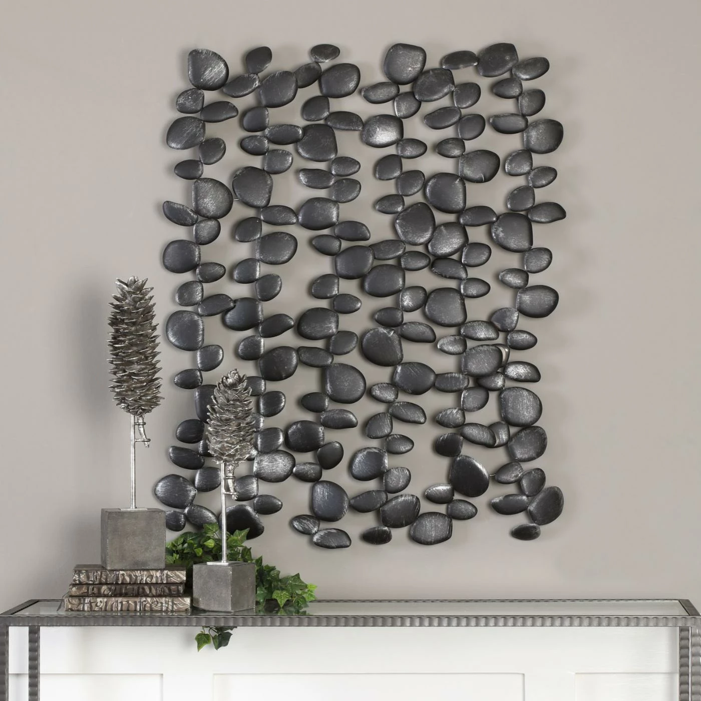 Make a modern statement with the Uttermost Skipping Stones Forged Iron Wall Art. This sculptural piece adds an elemental sensibility with its hand-forged iron stones and thoughtful placement. A charcoal black finish with silver undertones adds a sense of dimension to this beautiful wall art sculpture.
