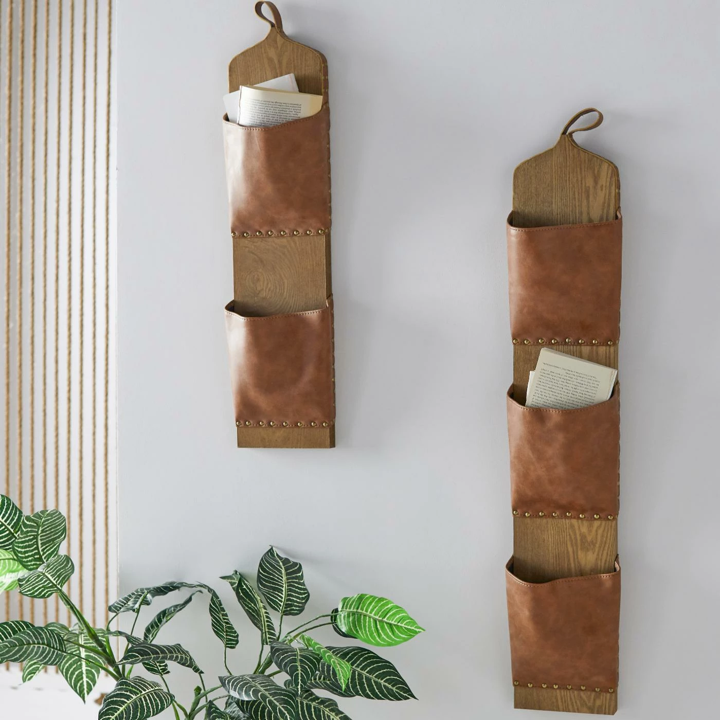 Add a rustic touch to your space with the DecMode 3 Piece Traditional Leather and Wood Mail Holder Set. These mail holders feature a sturdy wood and leather construction that’s complemented by a rich brown finish thatβs easy to pair with most color schemes.