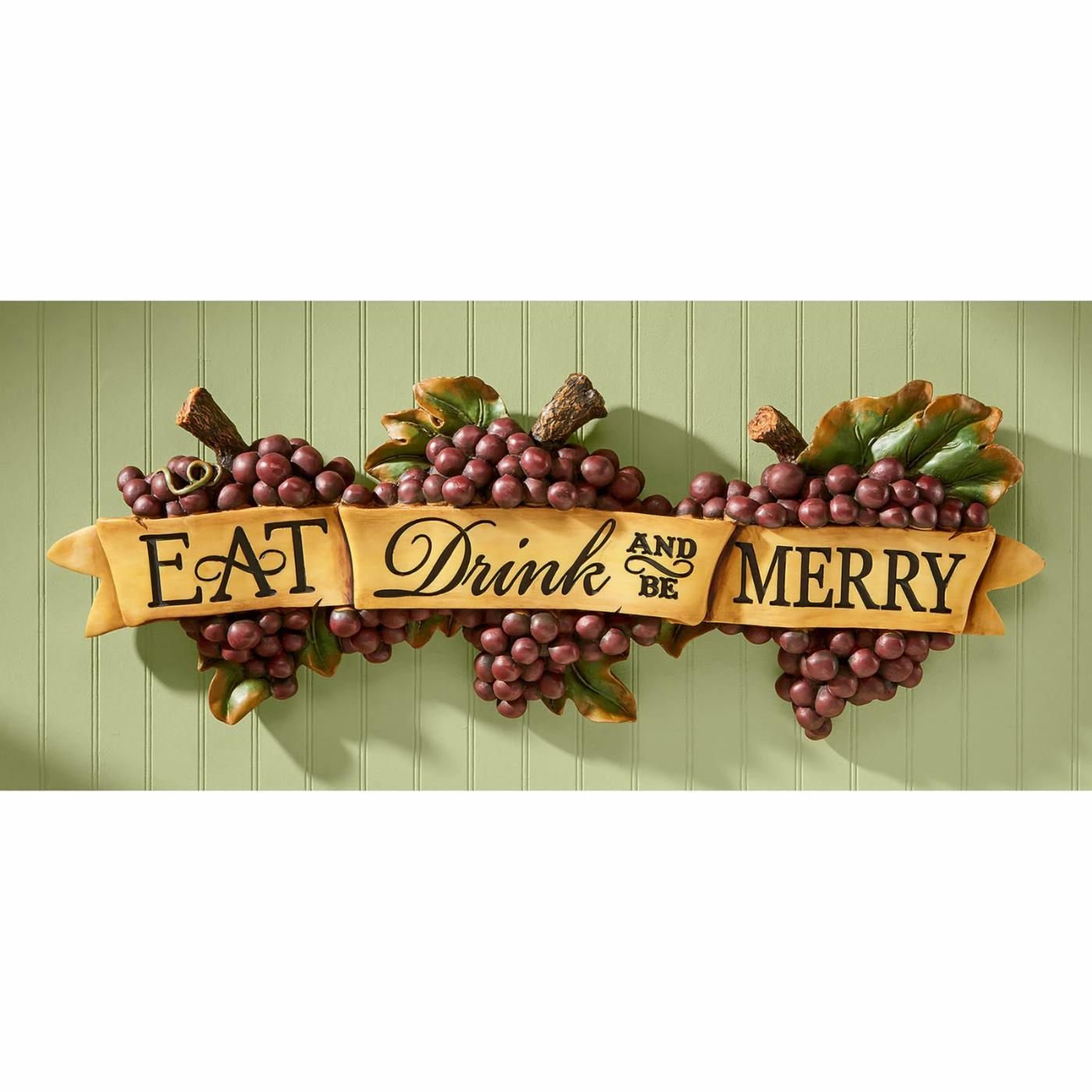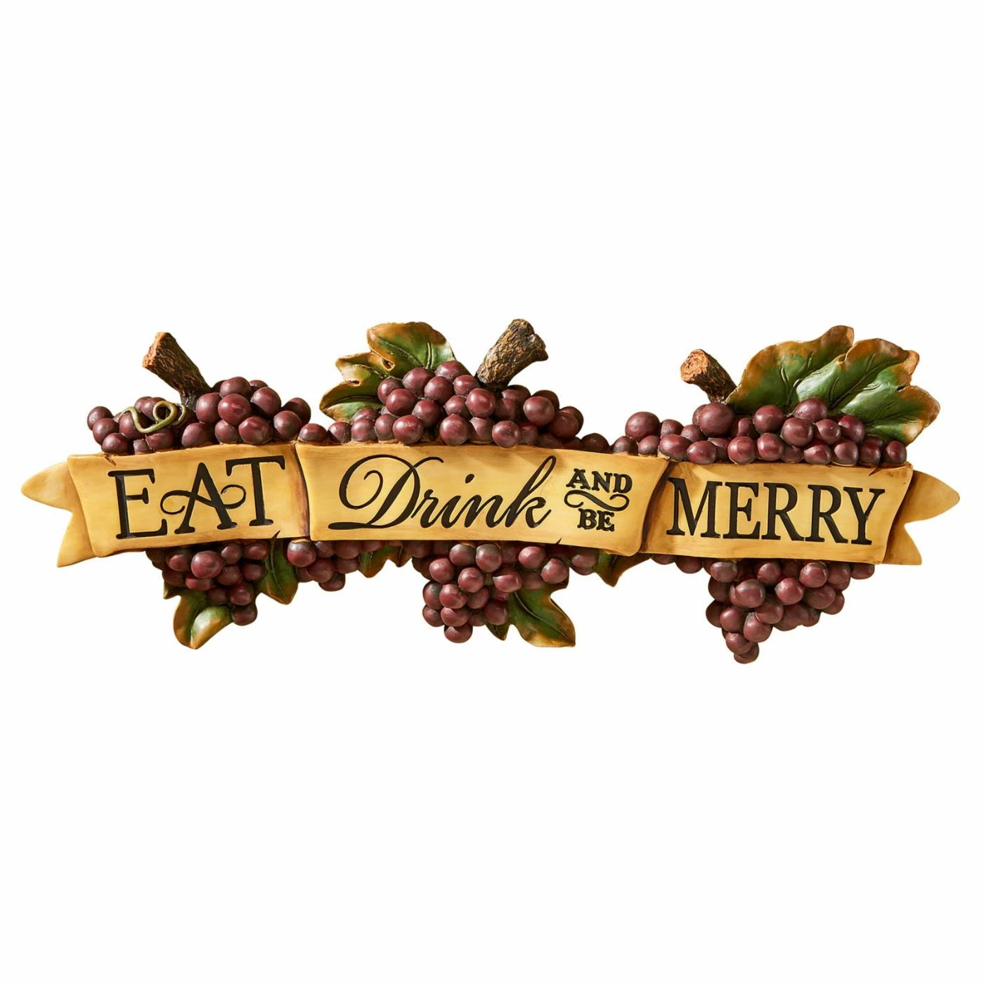 Celebrate life with the Design Toscano Eat Drink and Be Merry Wall Sculpture. This playful wall art lets guests know what kind of lifestyle you live and welcomes them to join in the fun. A mixed-font sign spans a banner that scrolls over three bunches of purple grapes.
