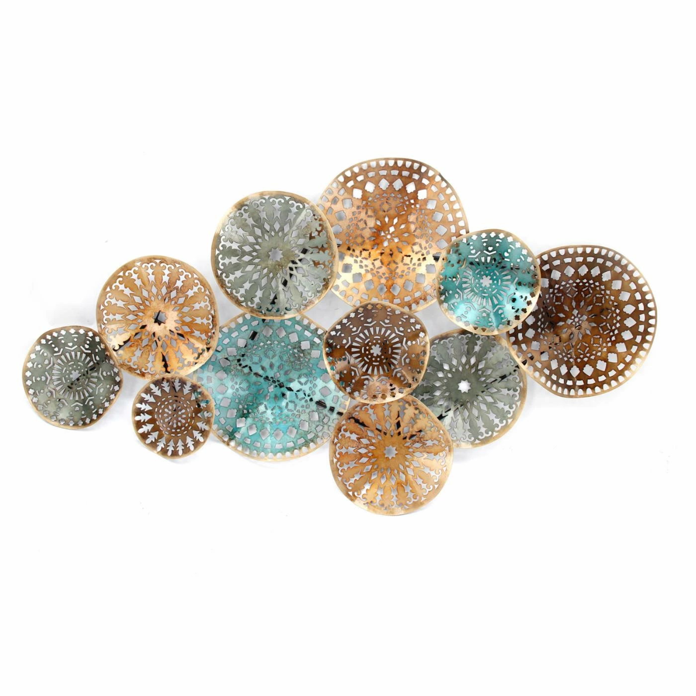 Filigree cutout circles in metallic teal, silver, copper, and bronze give the Sagebrook Home Teal and Metal Circles Wall Sculpture its earthy glamour. The cut-outs allow your wall color to peek through, ensuring this wall sculpture will be unique to your space.