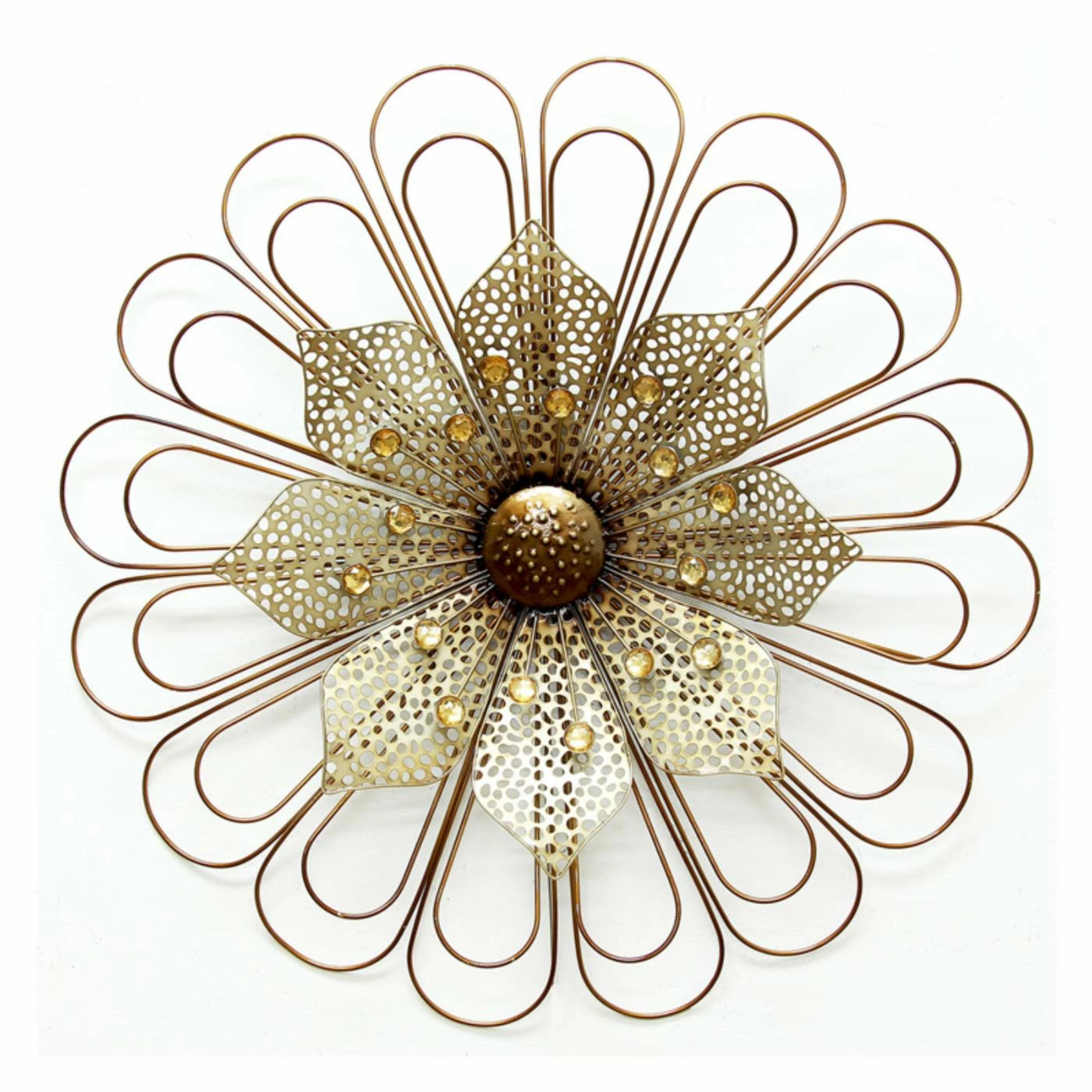 The Stratton Home Decor Champagne Wire Flower Wall Sculpture brings several different styles and textures together to craft a modern, layered flower sculpture. The shiny finish is elevated with stones in the center that give it oodles of added sparkle.