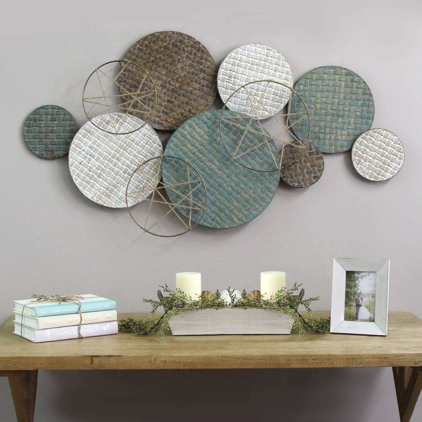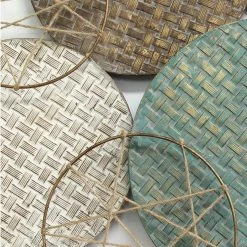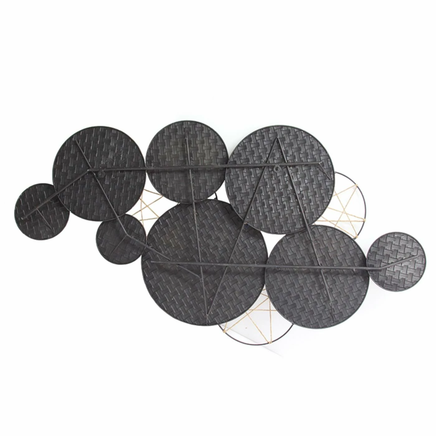 Enliven empty wall space with the Stratton Home Decor Woven Texture Metal Plates Wall Sculpture featuring a rustic motif of solid and open circles with beige and brown jute accents. Hang this modern wall sculpture in any room to lend your space a layer of drama and visual interest.