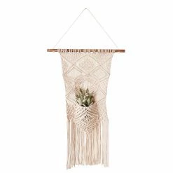 Use the pocket on your new 3R Studios Macrame Wall Tapestry as a catchall in your entryway or to hold a lightweight potted plant. Diamonds and long fringe add detail to this simple, natural cotton blend macrame wall tapestry. A stained rod support keeps the tapestry flush to your wall.