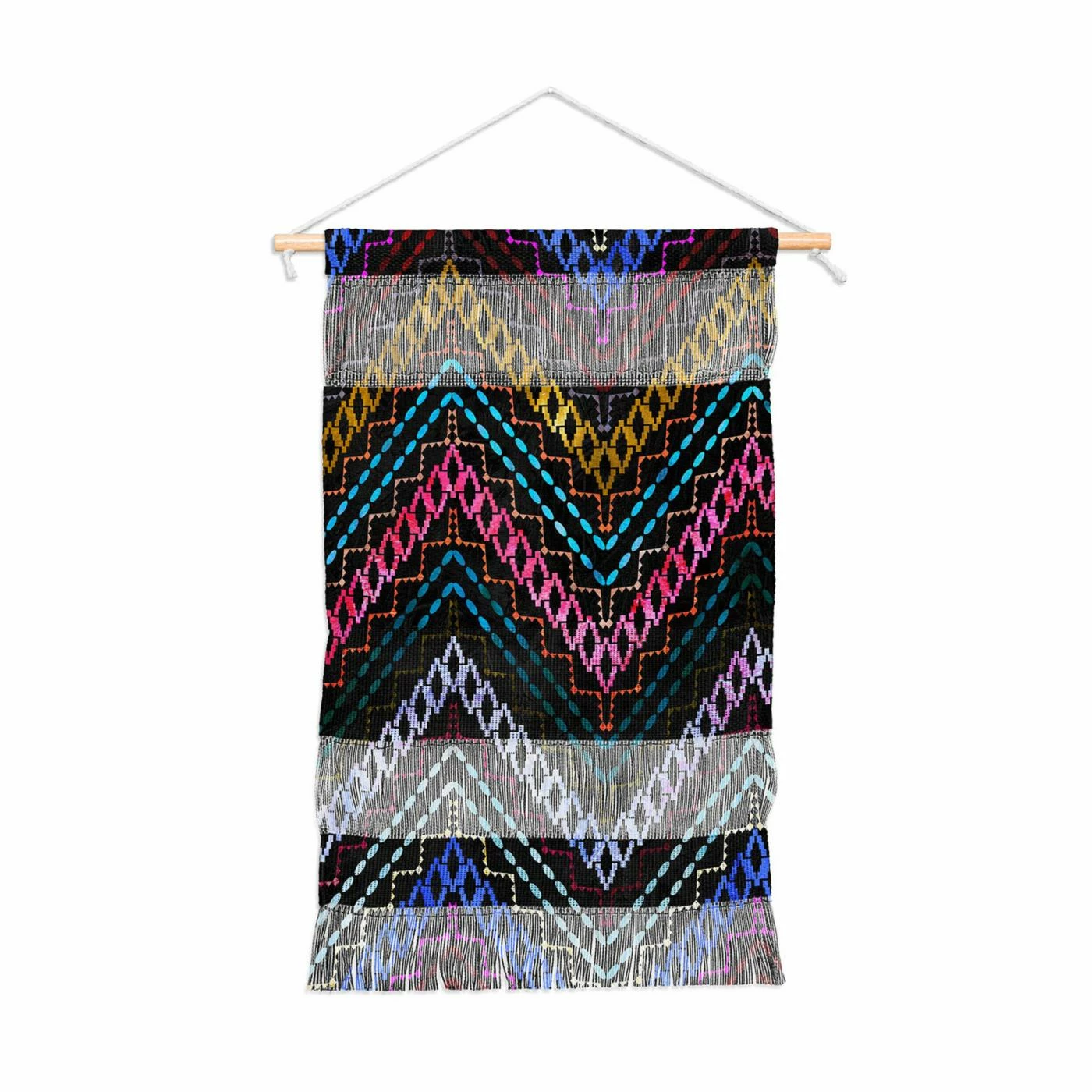 Printed on a black background, the pink, blue, and yellow geometric pattern of the Deny Designs Aviana Chevron Multi Portrait Wall Hanging commands attention. The polyester construction of this wall hanging ensures colors that won’t fade, and its woven design creates an elegant, tapestry-style look.