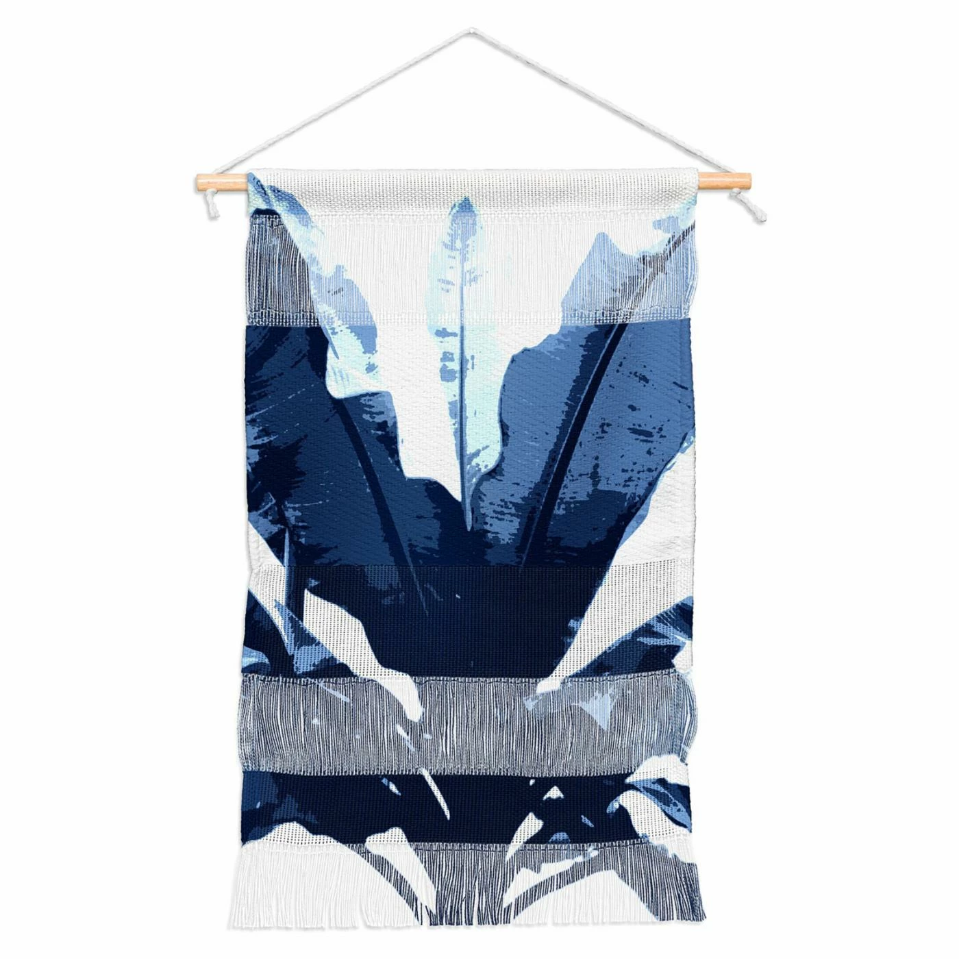 A palette of refined blue makes up the expansive banana leaf pattern spreading across the Deny Designs Bananarama Navy Wall Hanging. This cool wall hanging is woven using durable polyester yarns. It hangs freely from a minimalistic wooden dowel.