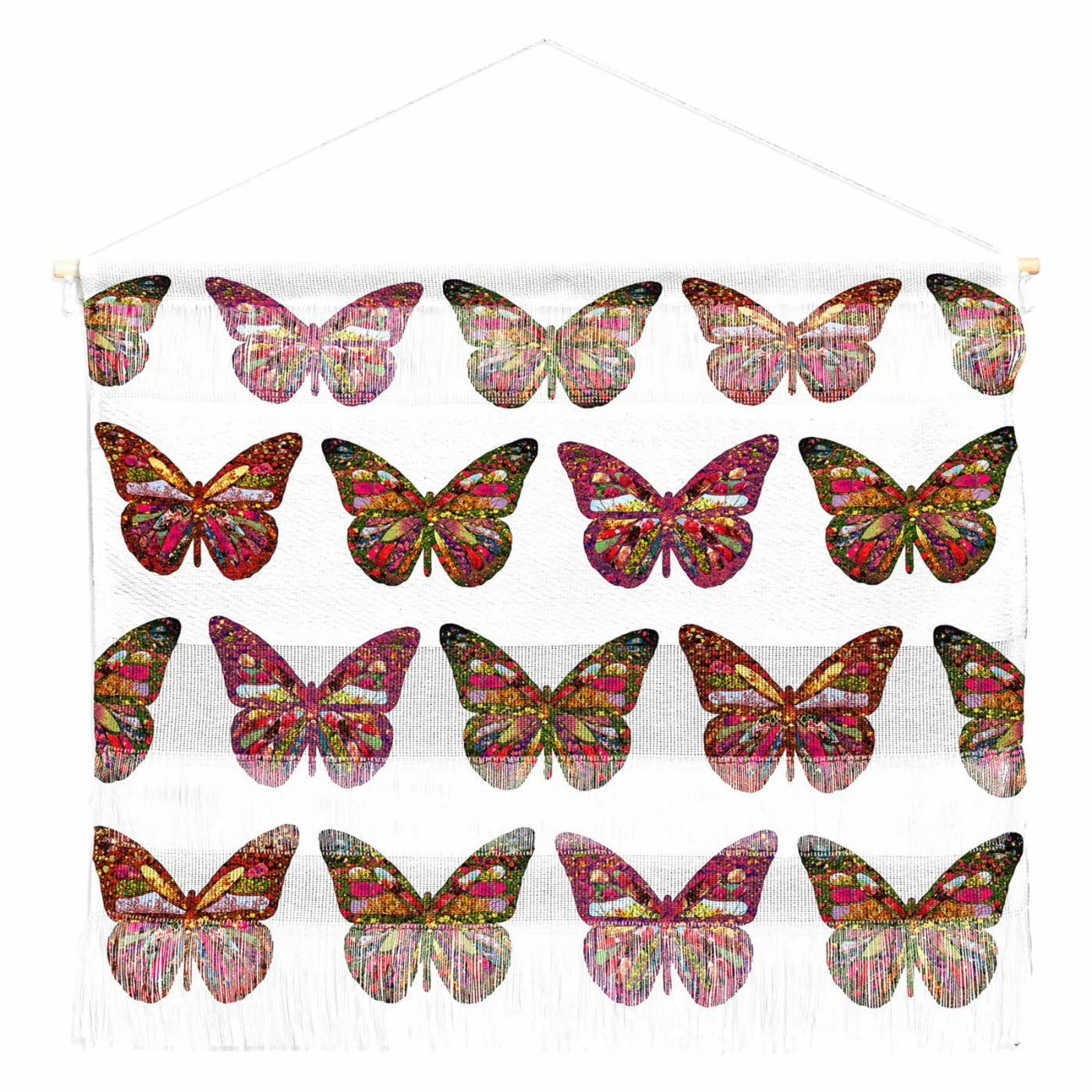 A pattern of vibrant, colorful butterflies decorates the Deny Designs Bianca Green Butterflies Fly Wall Scroll. This polyester tapestry features rich texture with a row of fringe along the bottom.