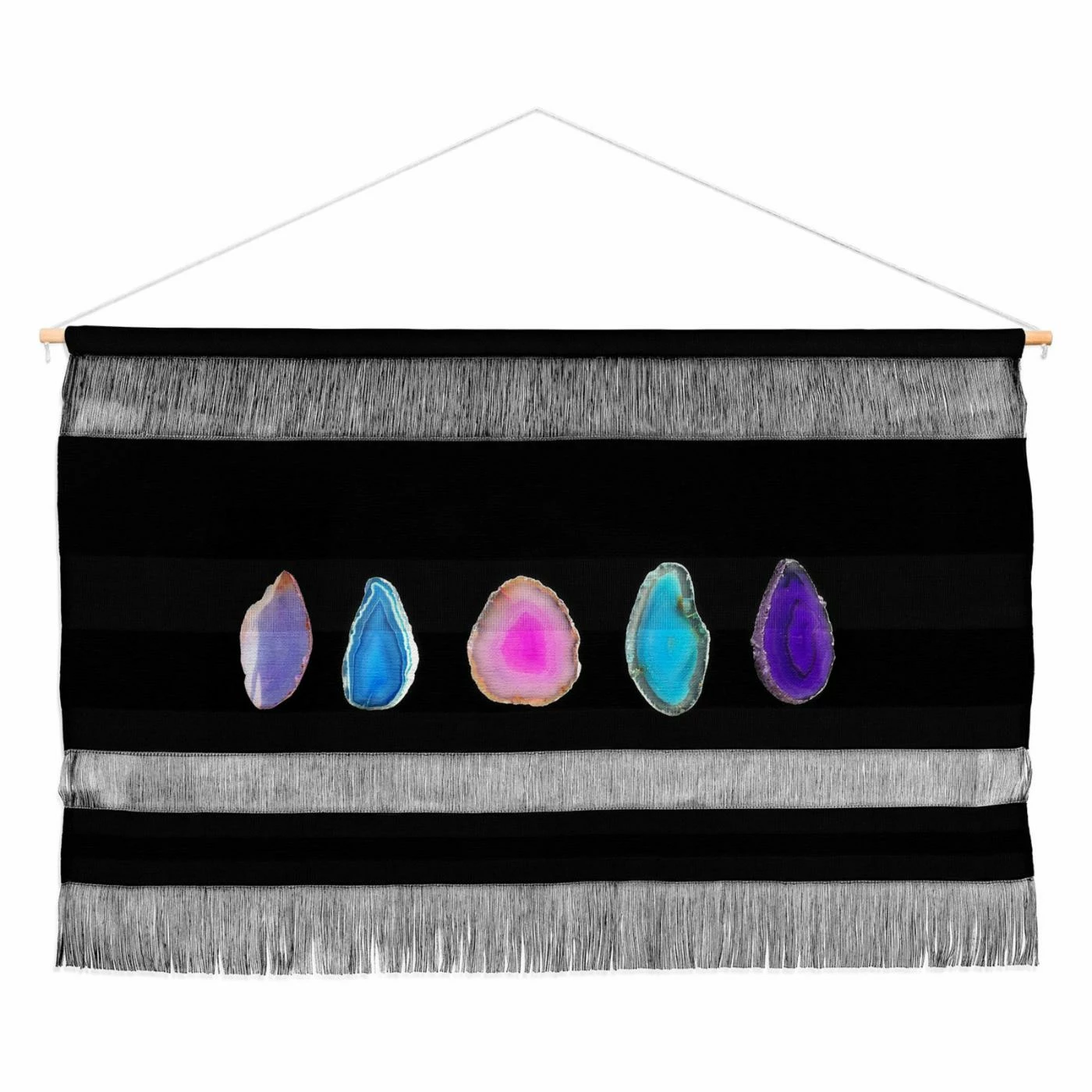 A variety of colorful agates are lined up against a black background, allowing them to really pop on the Deny Designs Chelsea Victoria Agate Collection Wall Scroll. This tapestry brings dimension and texture to your space with a woven polyester construction and fringe.